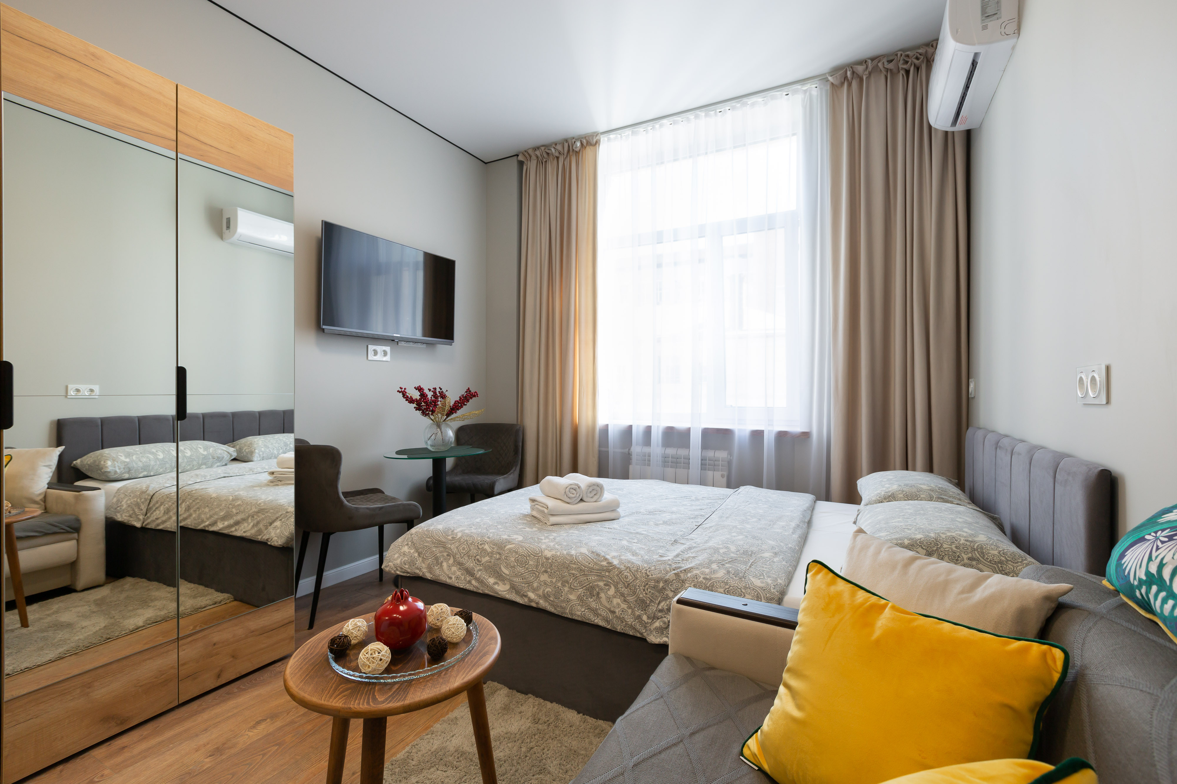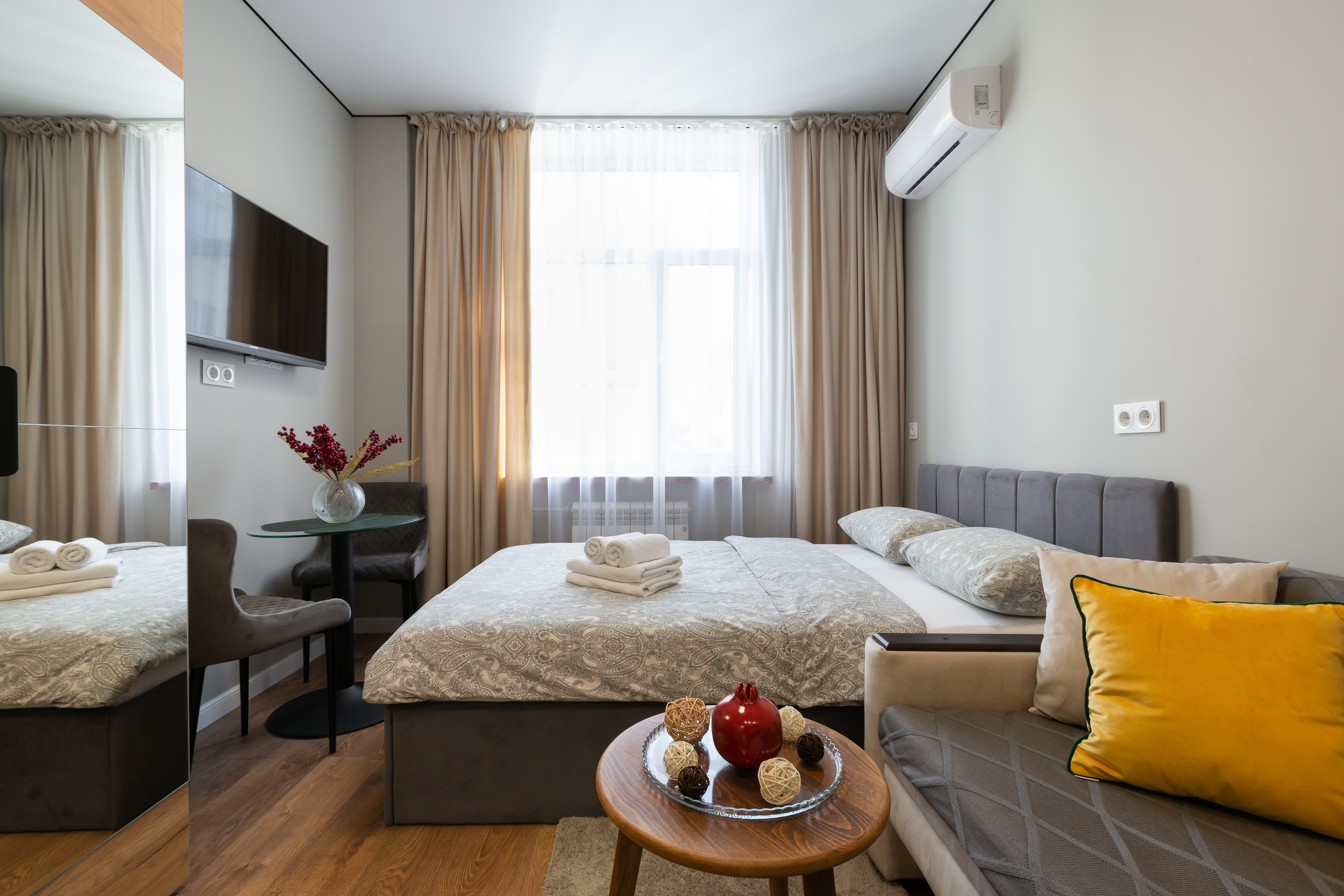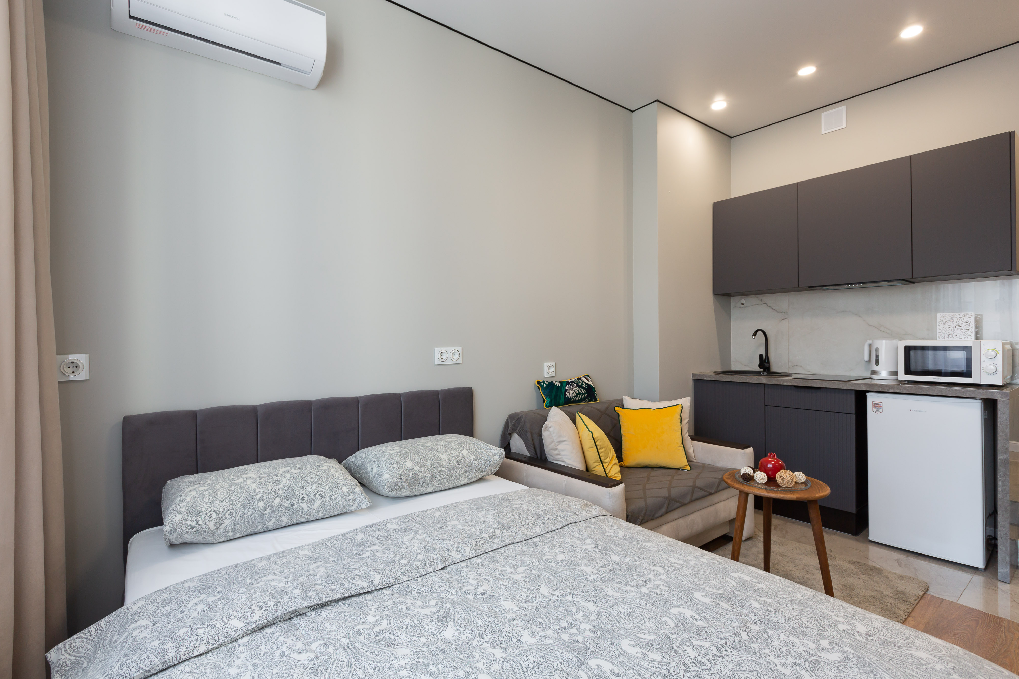 Современная мебель 🛋 , двухспальная кровать и двухместный раскладной диван, бытовая техника, скоростной WI-FI, Спутниковое ТВ 📺, стиральная машина, кондицонер, гладильная доска, сушка для белья , оборудованная кухня, полный комплект посуды 🍽 для приготовления и приёма пищи .