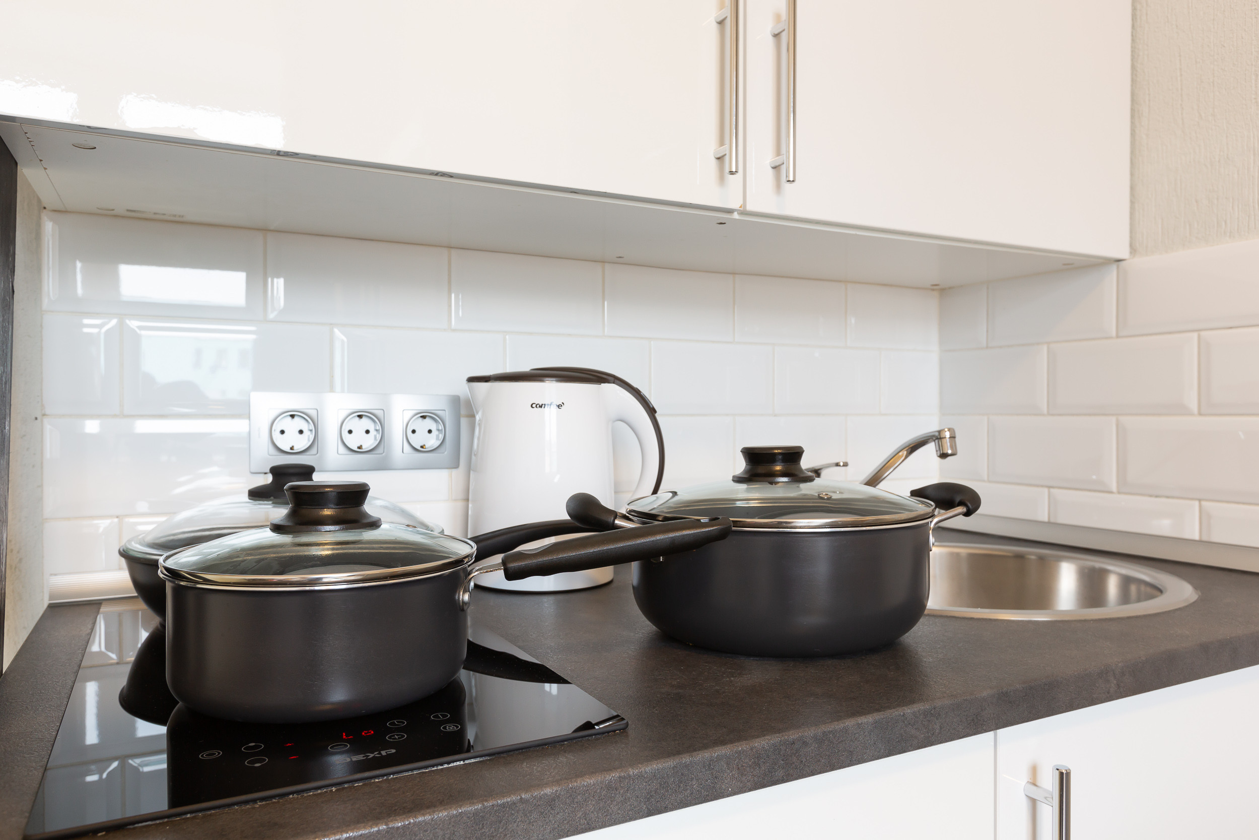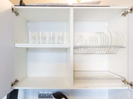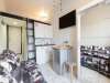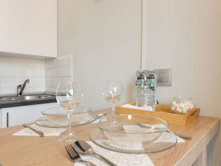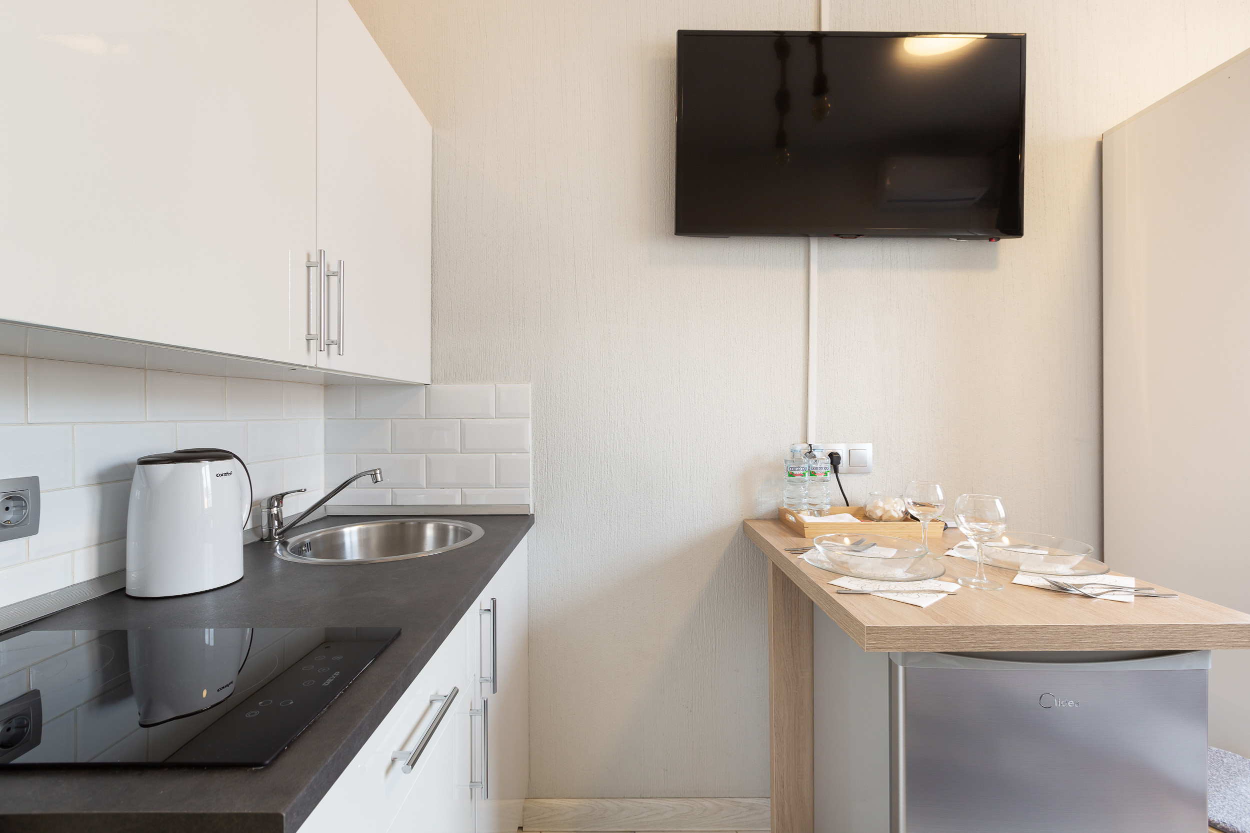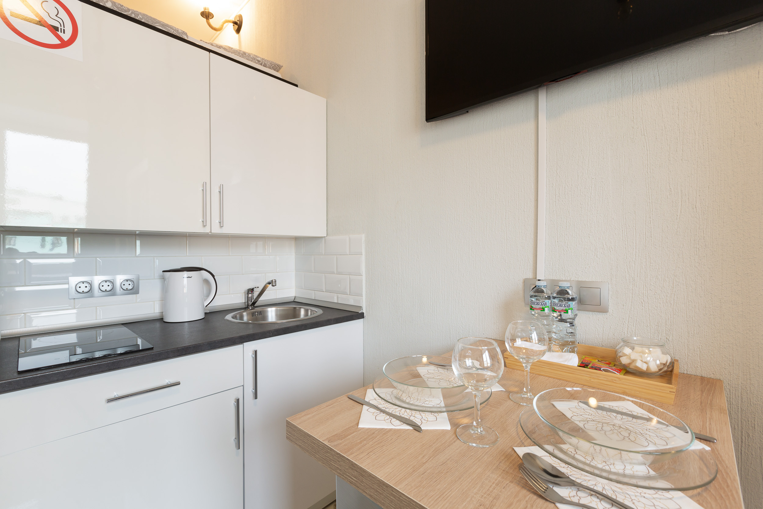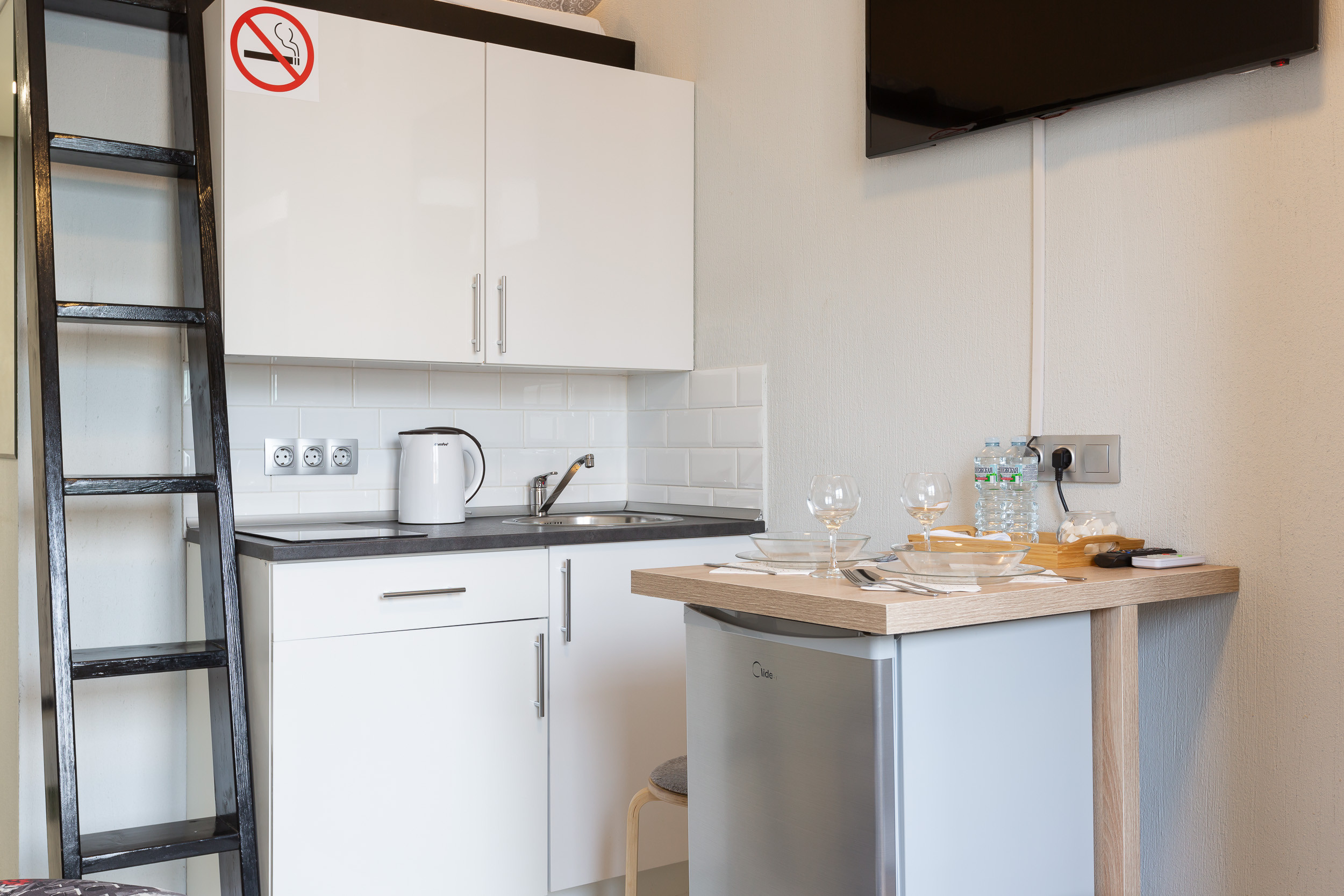 Функциональная часть пространства представлена столом и кухонным уголком с сенсорной электроплитой. На кухне имеется вся необходимая посуда и столовые приборы.
