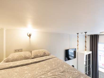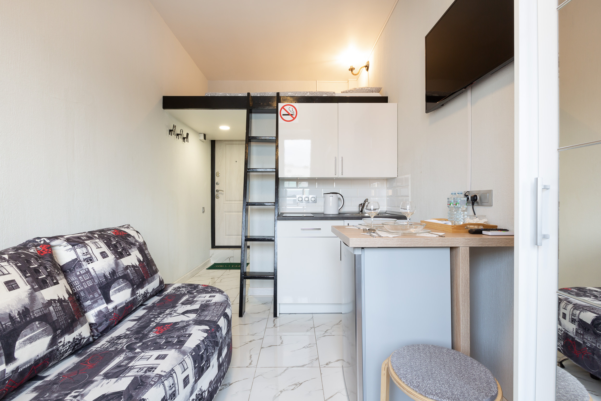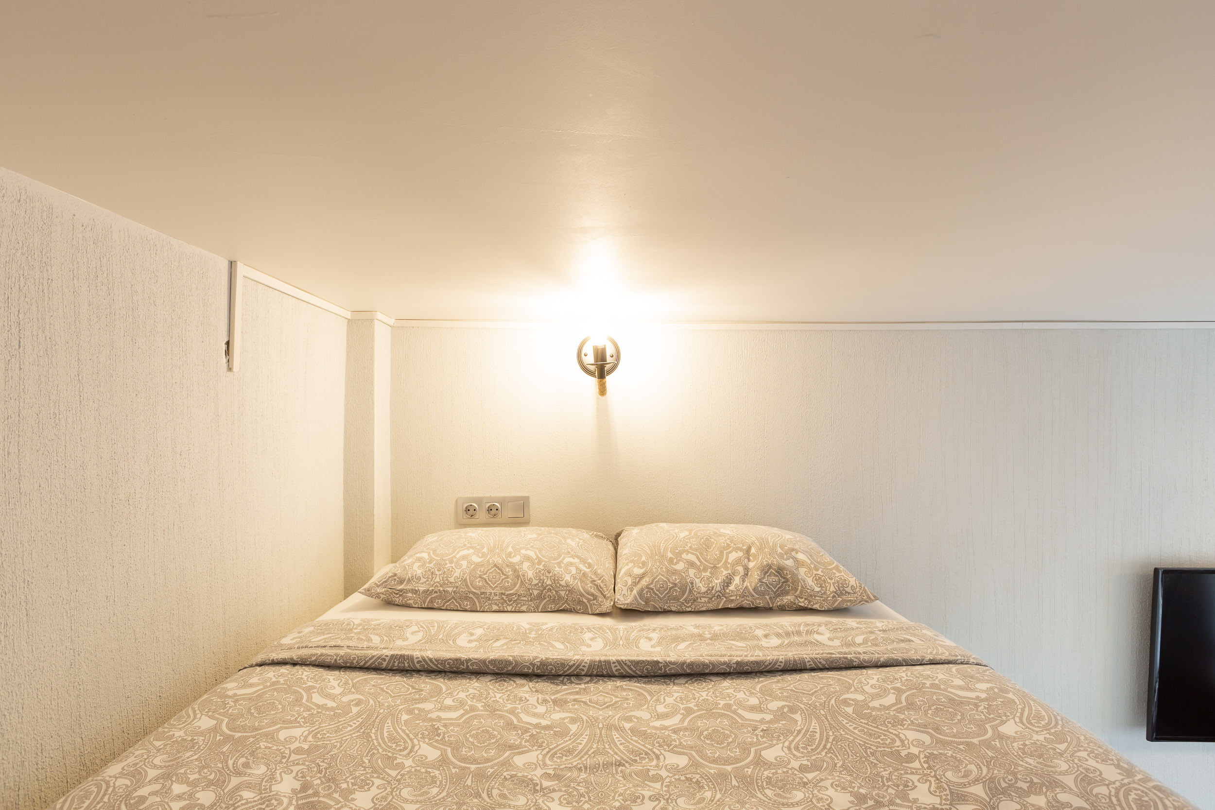 Комфортная спальня сделана вторым ярусом. С кровати открывается вид на кухню-гостиную и панораму за окном. При каждом заселении кровать застилается чистым пастельным бельем. В ванной предусмотрен набор мыльных принадлежностей и мягких полотенец.