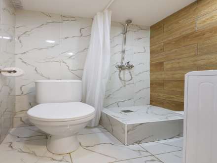 Кухня-гостиная представляет собой 2 зоны. Стильная кирпичная кладка, удобный мягкий диван и большое светлое окно делают гостиную максимально комфортной. Здесь можно почитать книгу, поработать за ноутбуком или посмотреть любимый фильм по кабельному ТВ. Wi-Fi бесперебойно работает на всей площади квартиры.