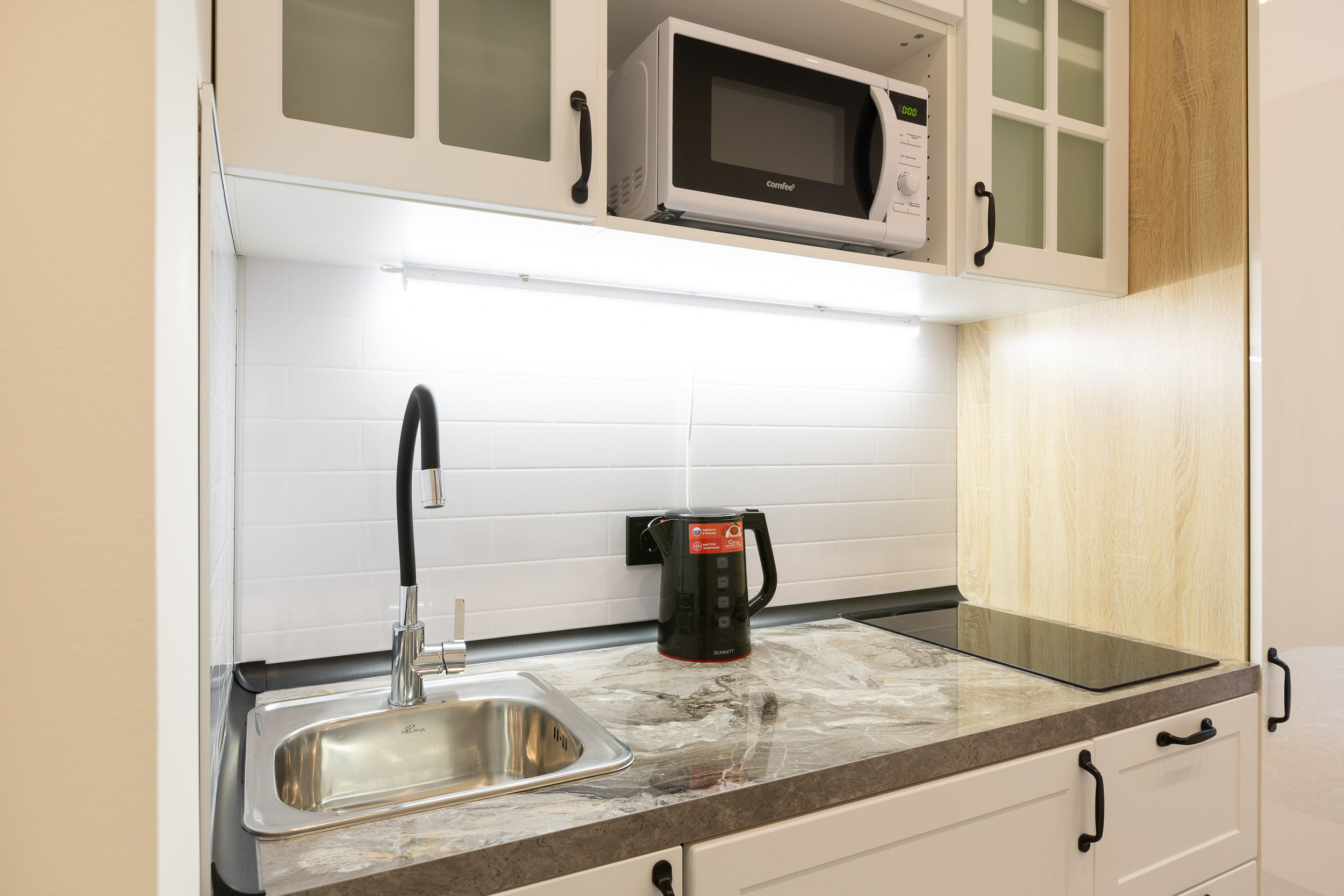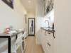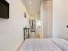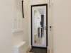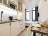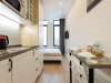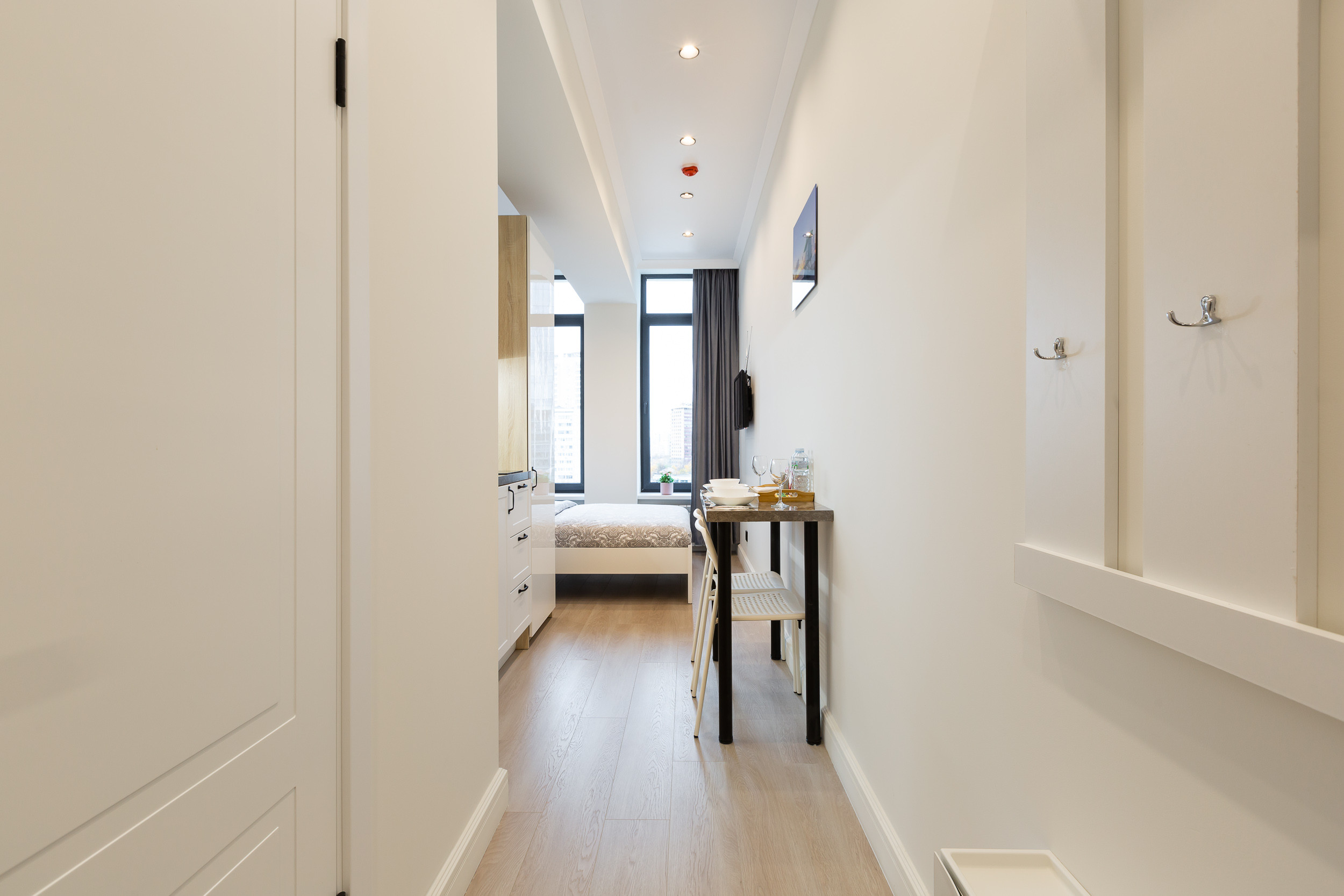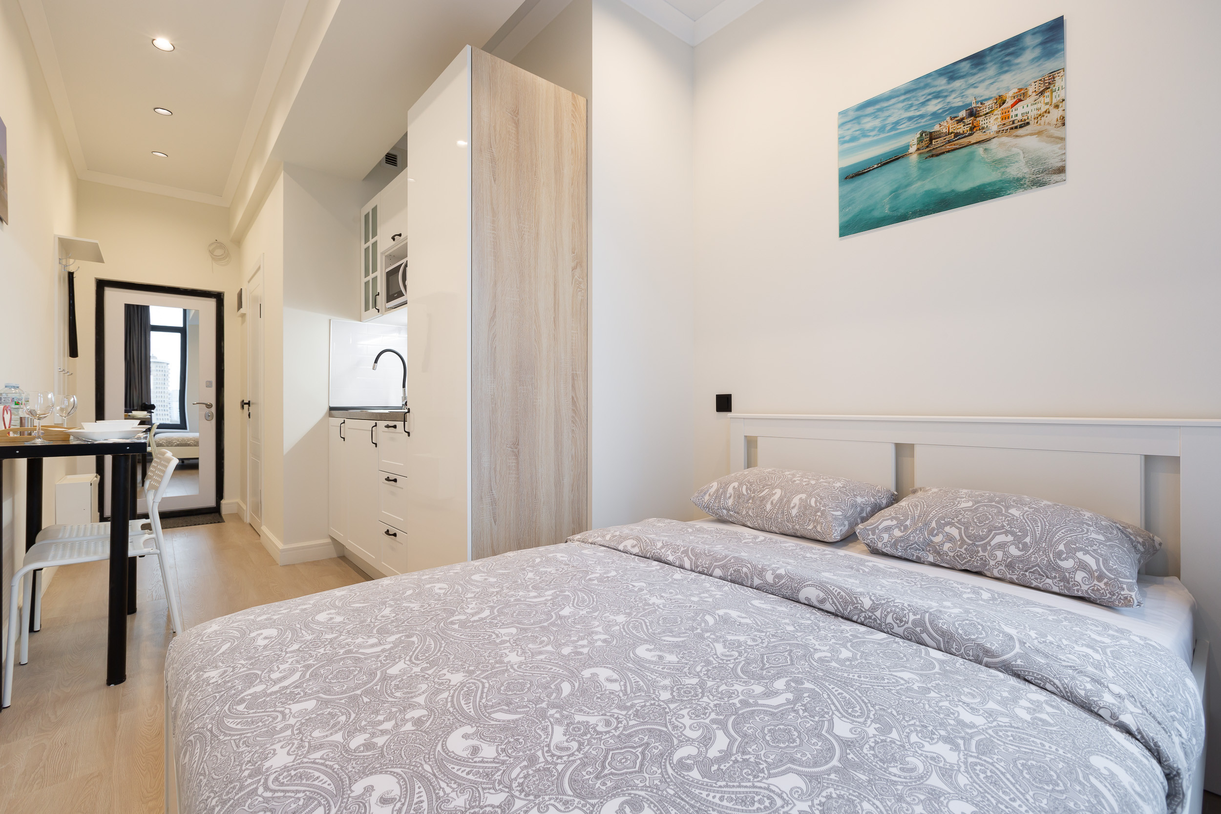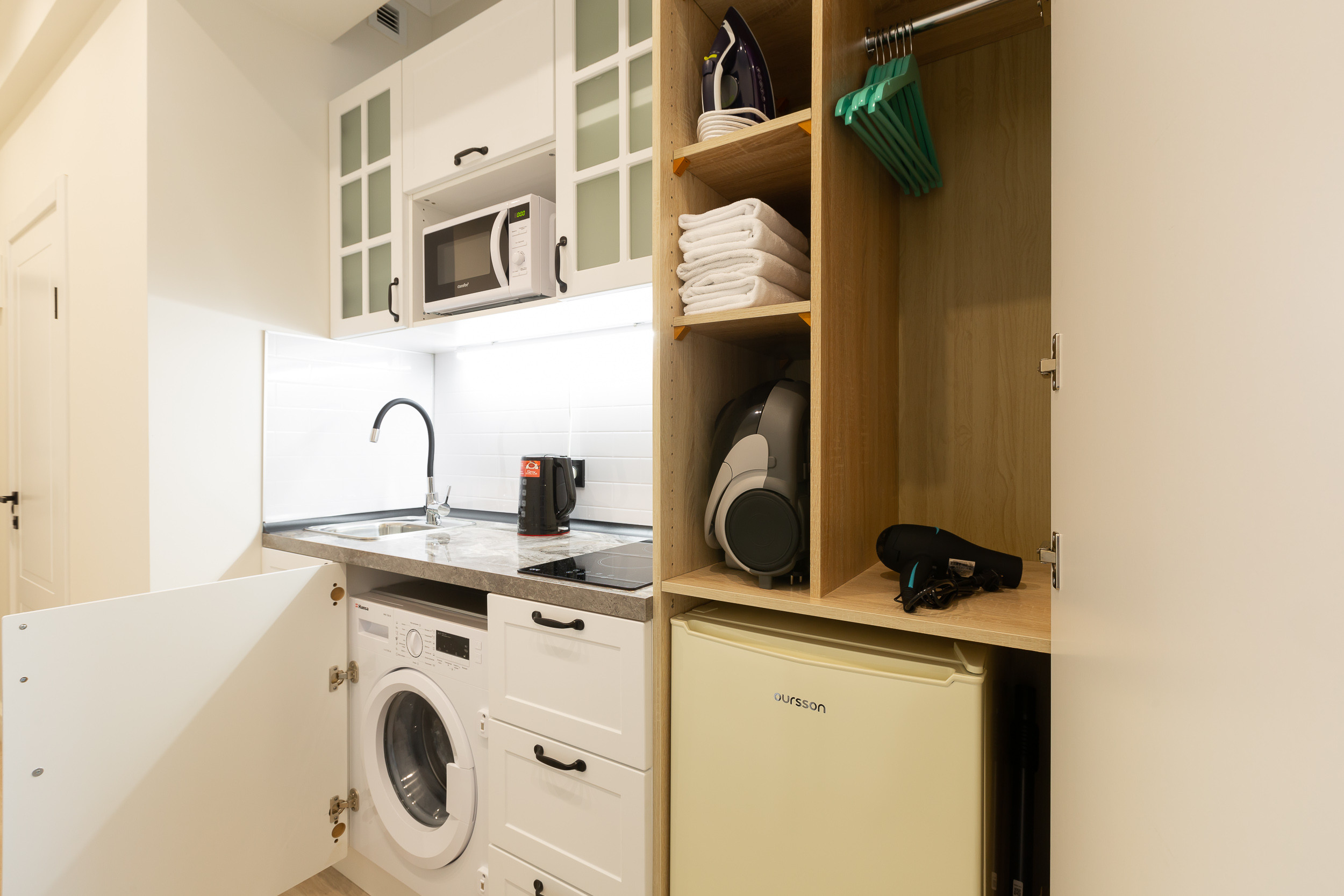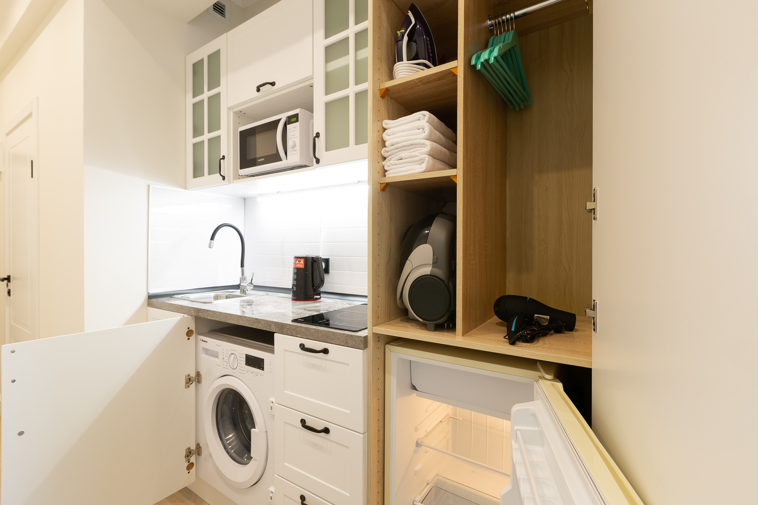 К кухонной мебели примыкает шкаф для одежды и полками, на которых вы найдете комплекты белоснежных полотенец, плечики, фен и пылесос.
