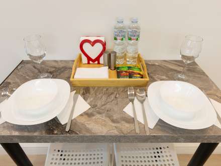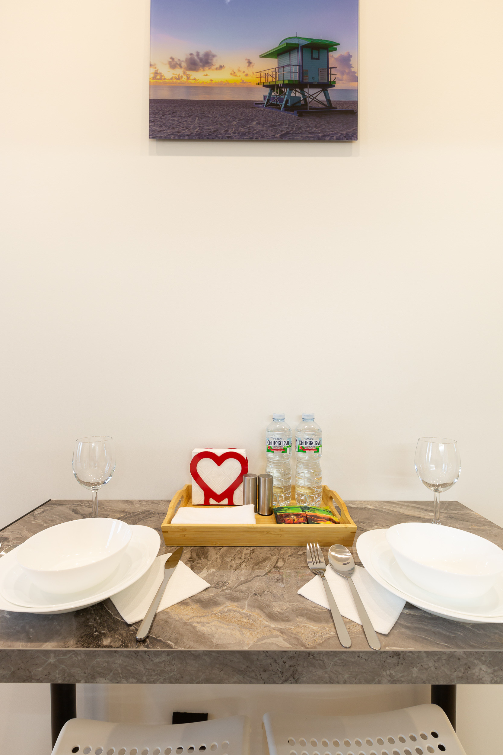 В обеденной зоне небольшой стол и два стула. На столике бесплатный чай, бутилированная вода, салфетки, соль и перец.