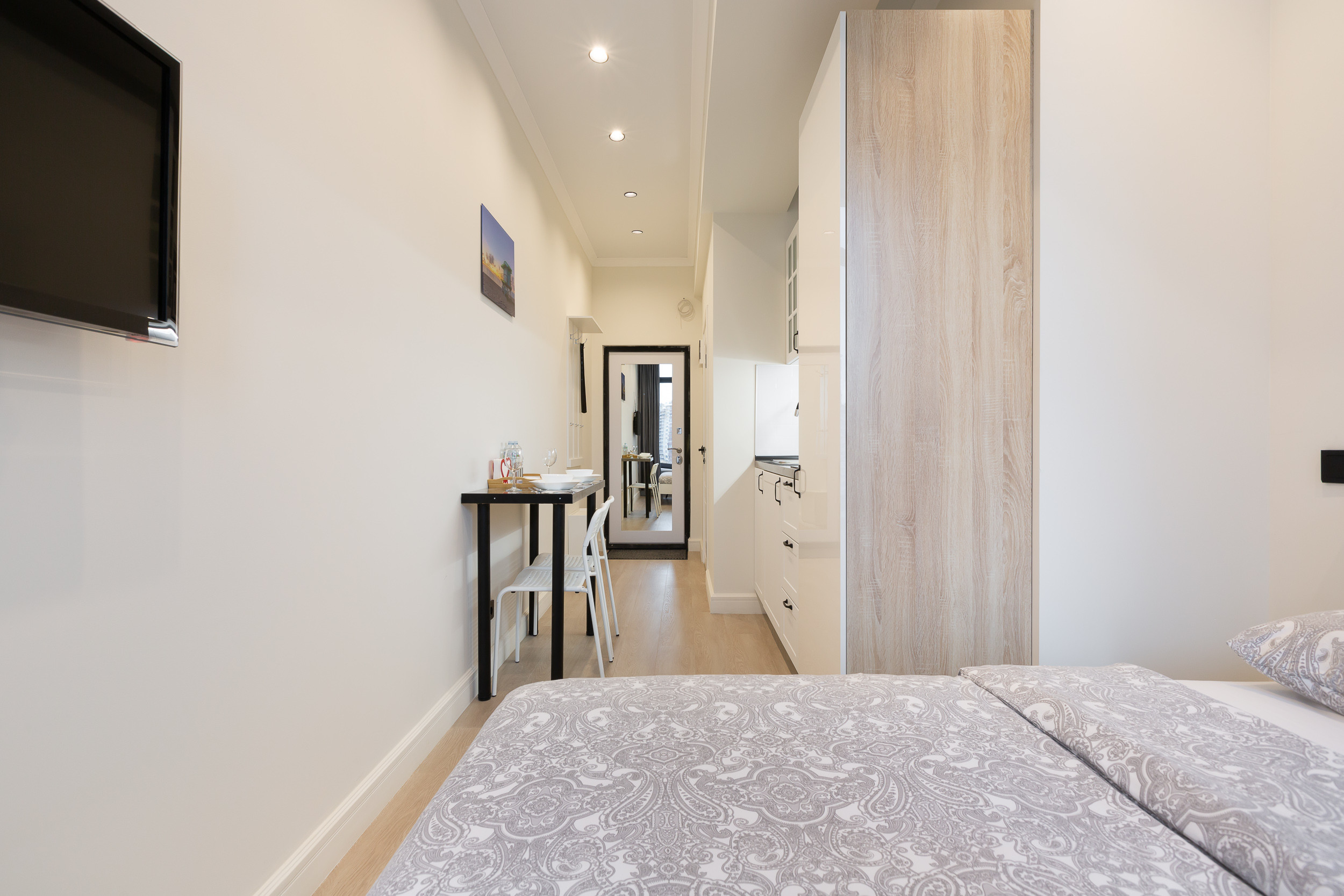 Напротив кровати на стене ЖК-телевизор с USB-входом. Помимо просмотра телепрограмм, можно смотреть фильмы и передачи с флешки. Также в квартире есть бесплатный и быстрый беспроводной интернет.