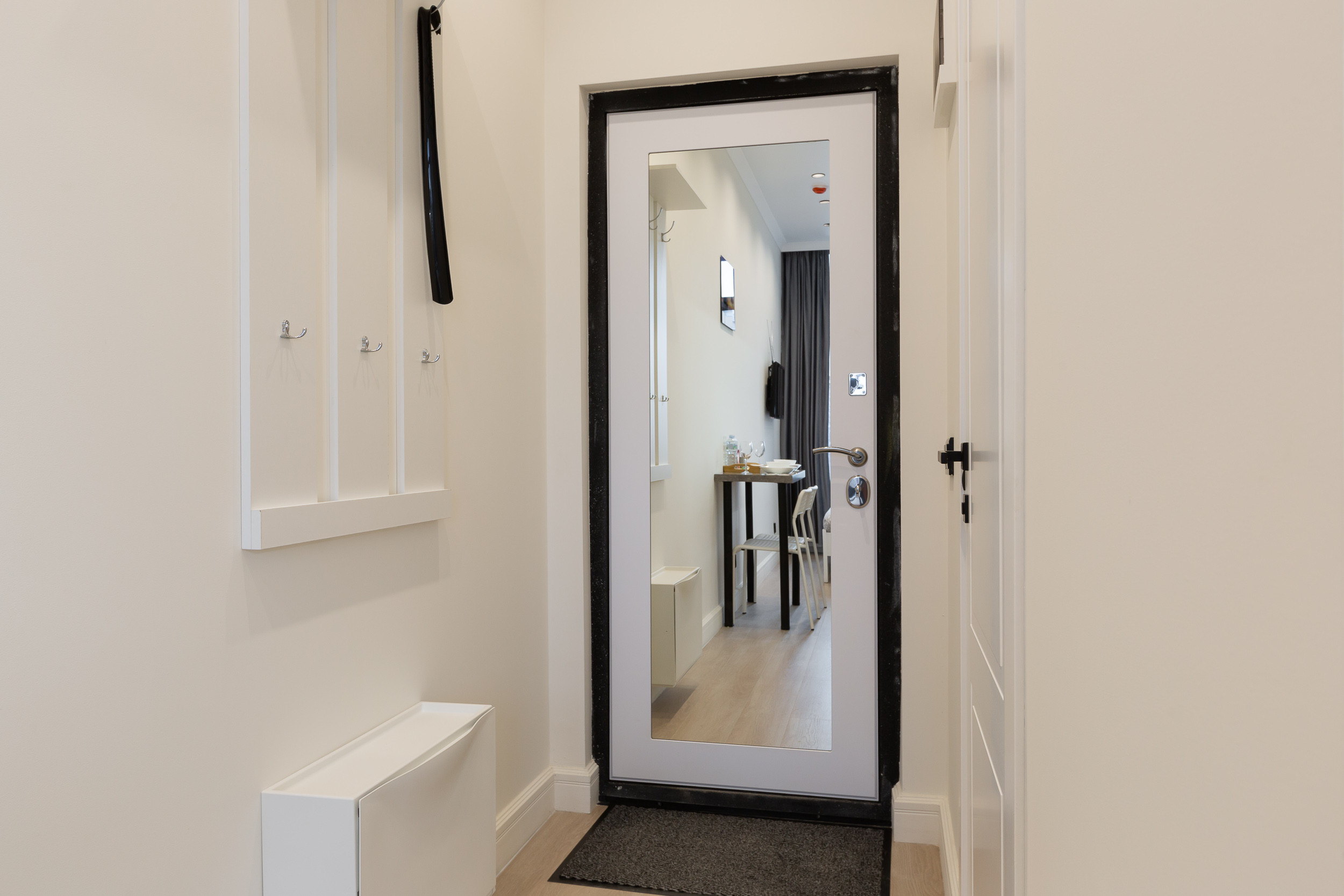 В прихожей большое зеркало на входной двери, Настенная вешалка для одежды и полка для обуви закрытого типа.