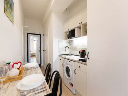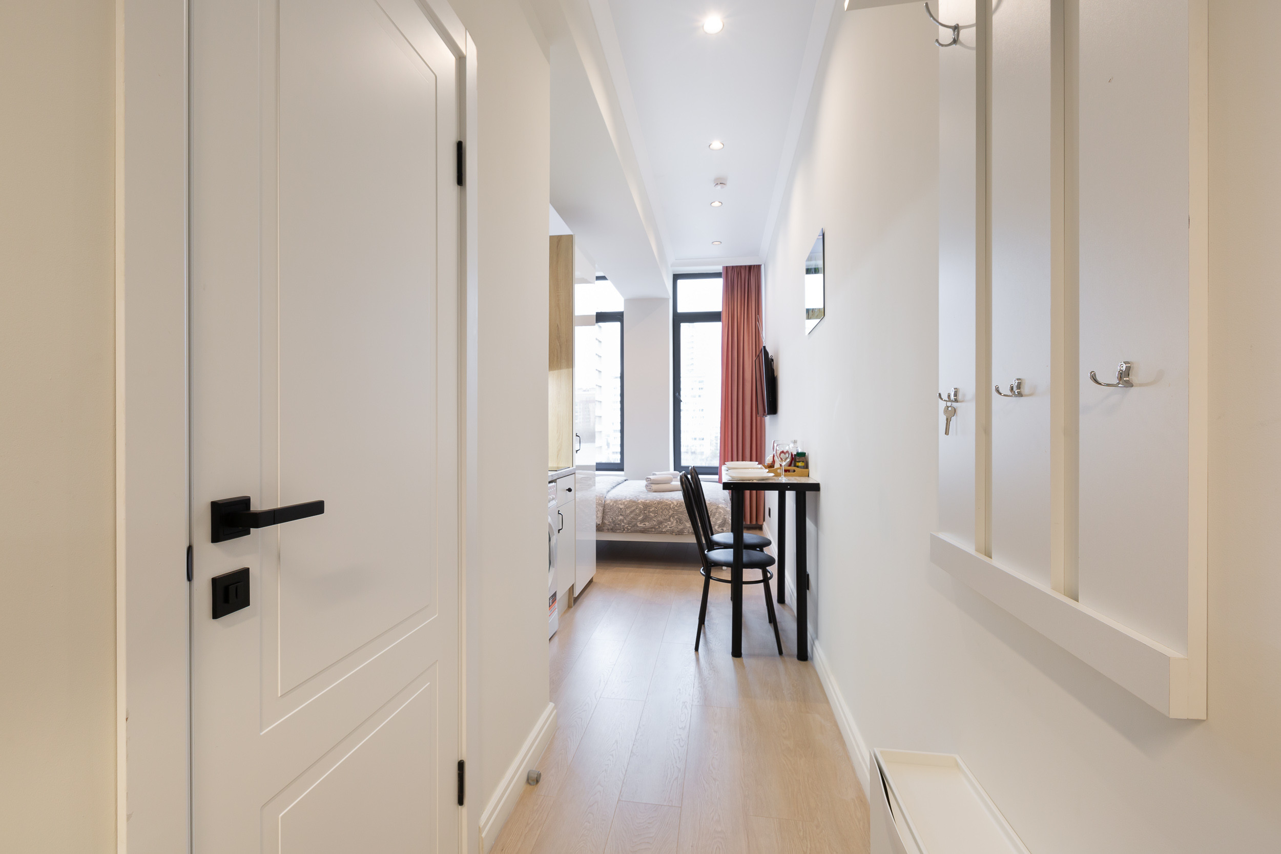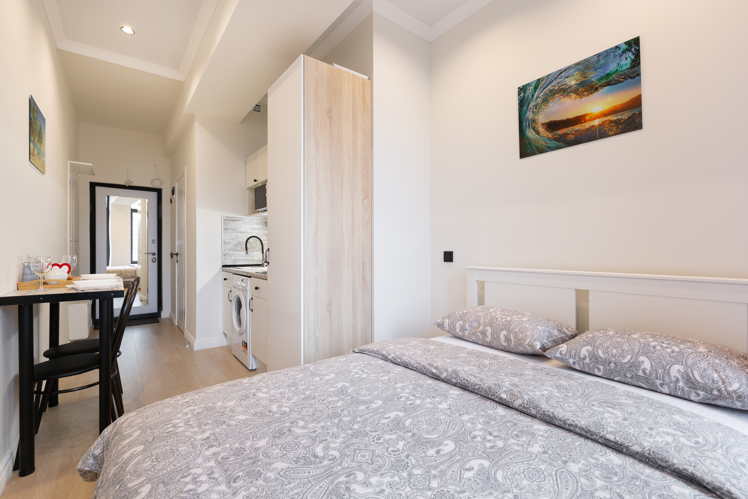 Квартира с евроремонтом, все помещения чистые и светлые, с новой мебелью. Планировка типа квартиры-студии, где дверь только в санузел.