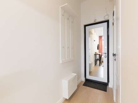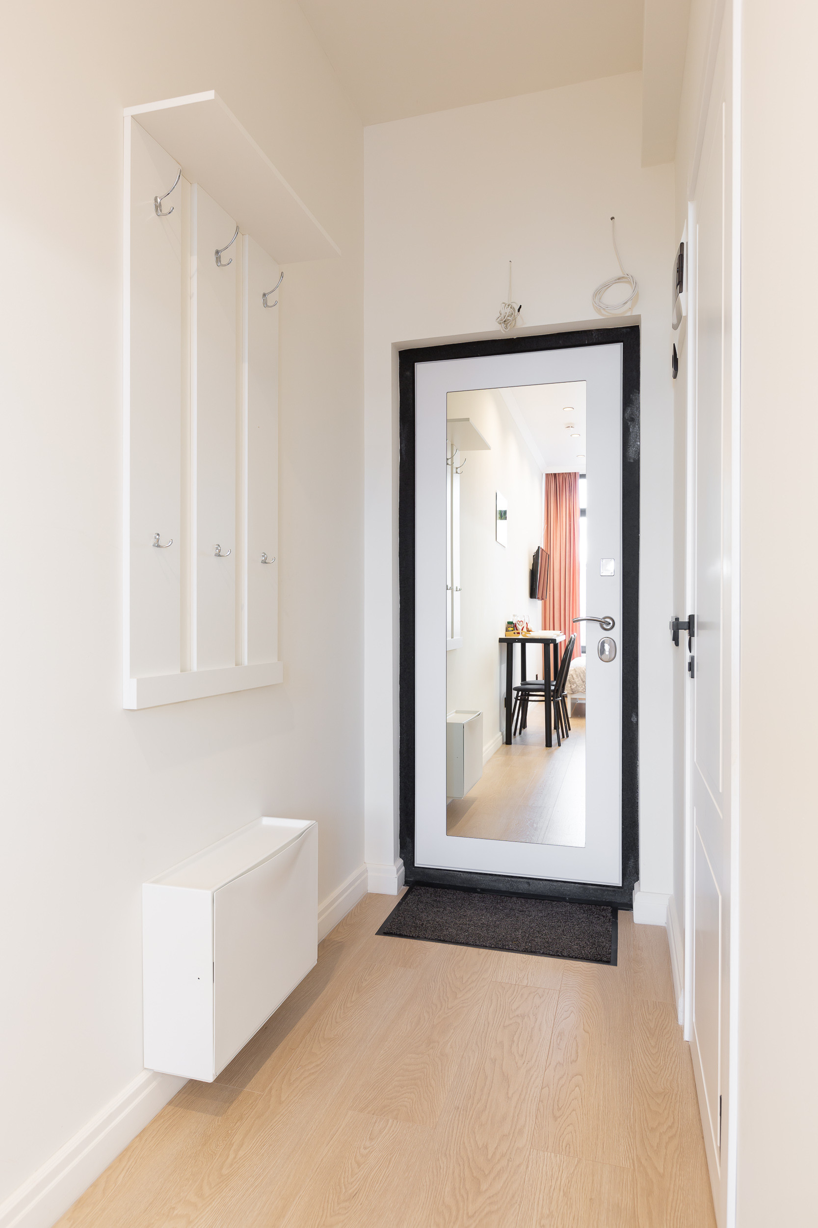 В прихожей на входной двери зеркало во весь рост и вешалка с плечиками для одежды. Есть просторный встроенный шкаф для вещей.