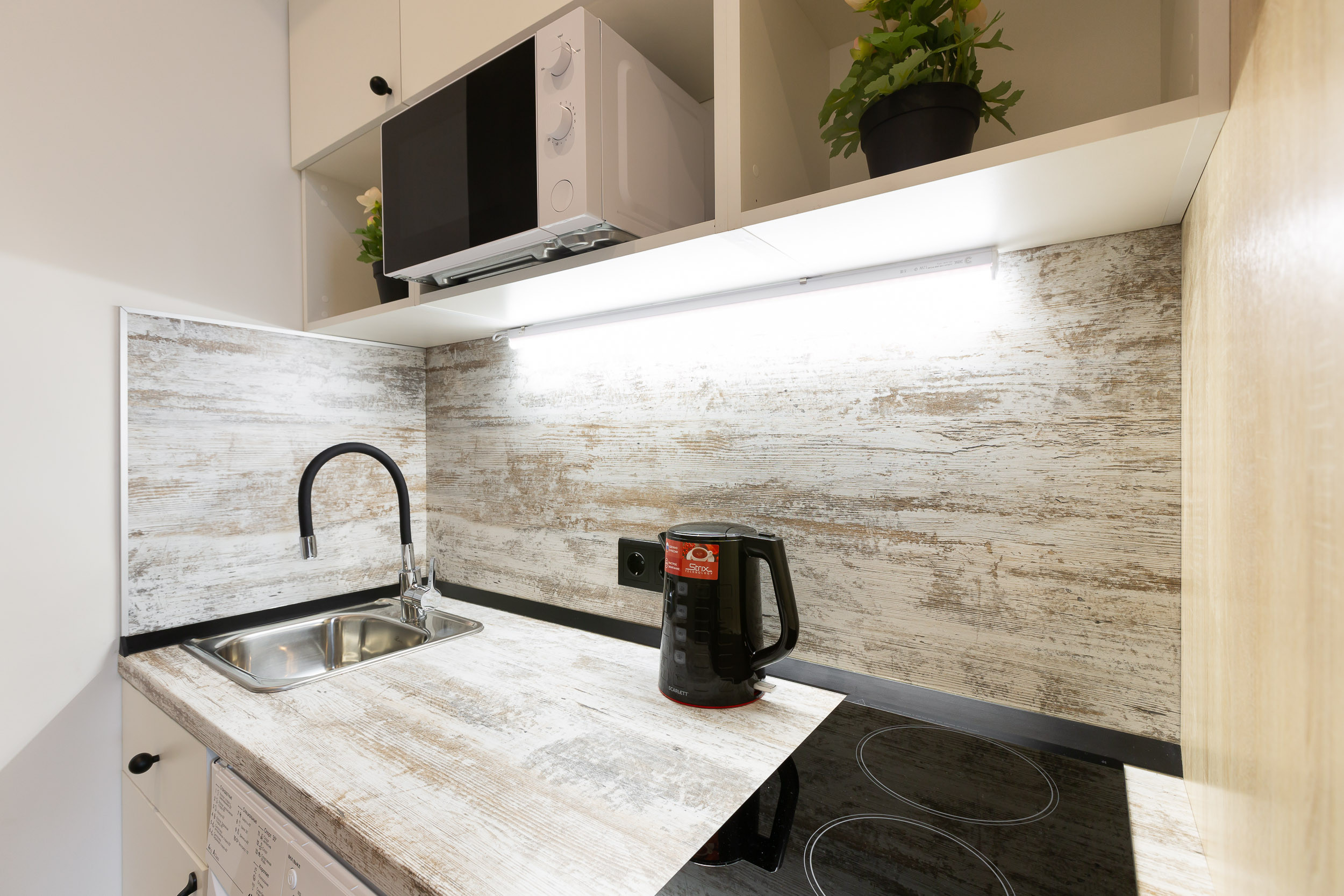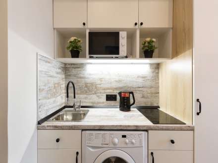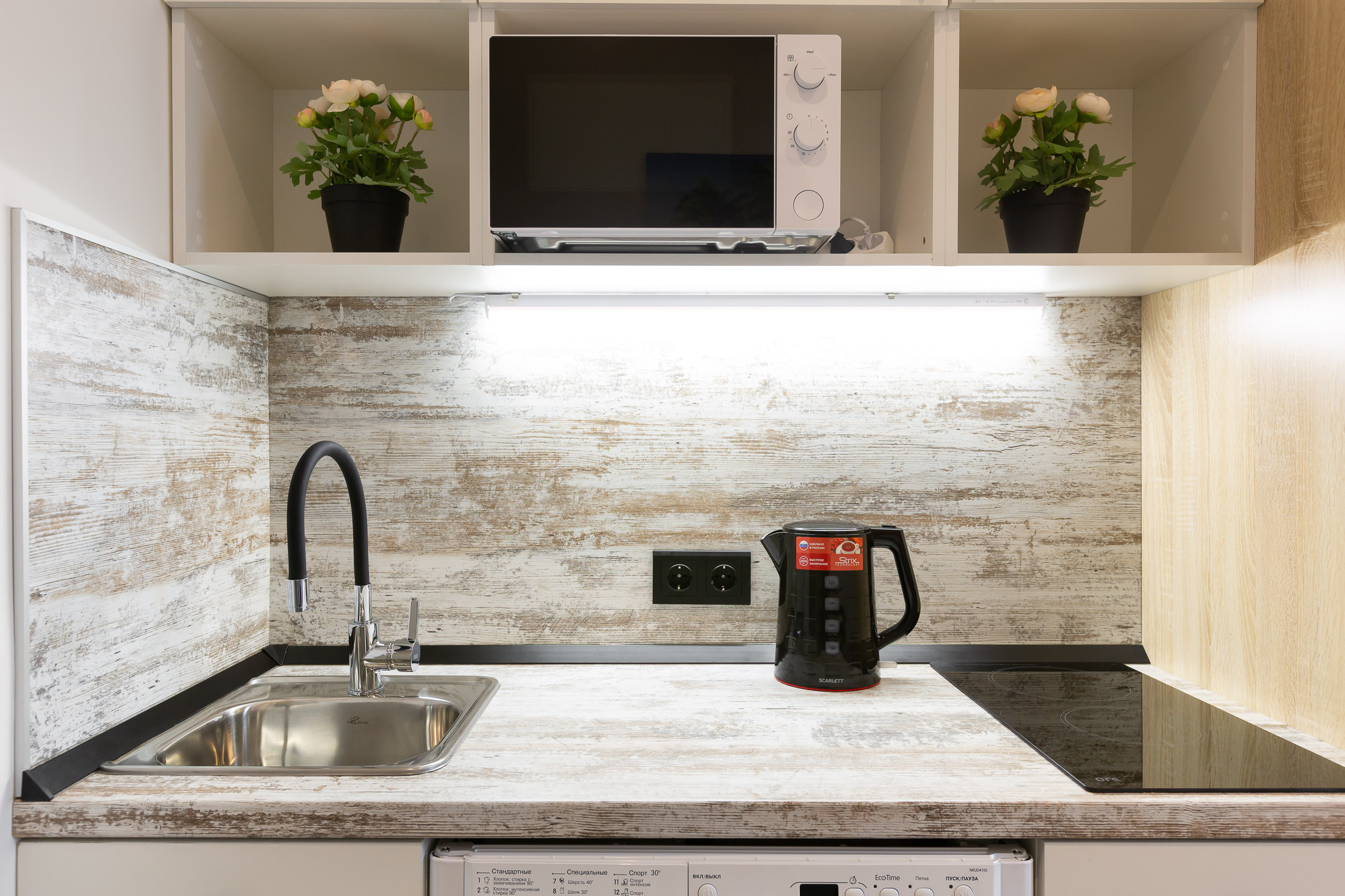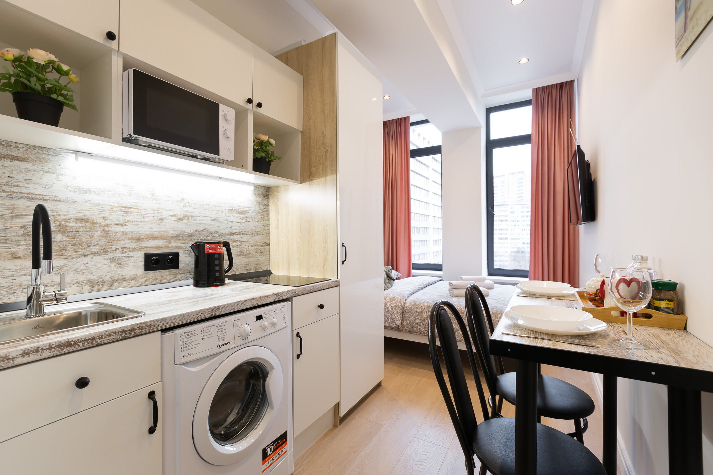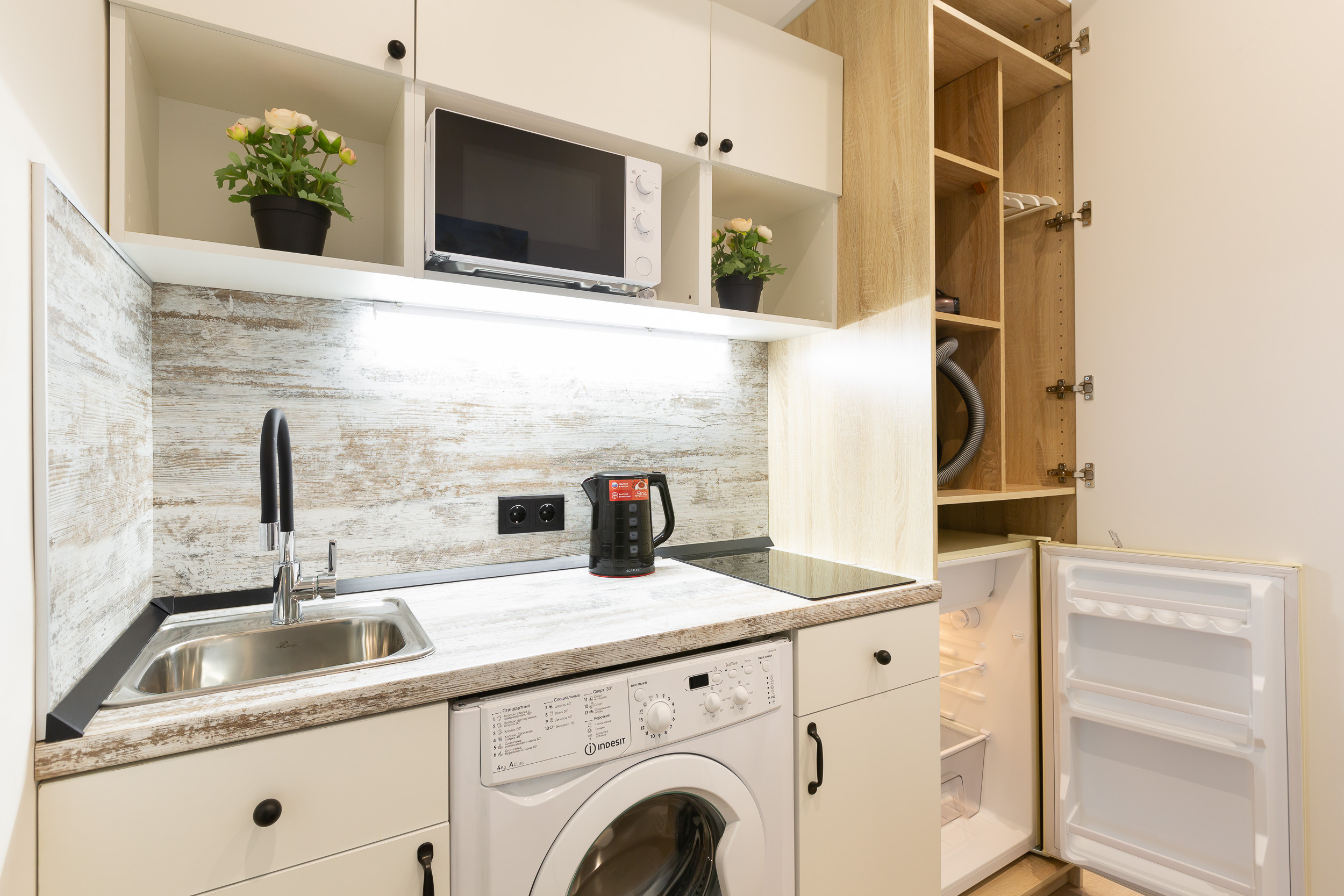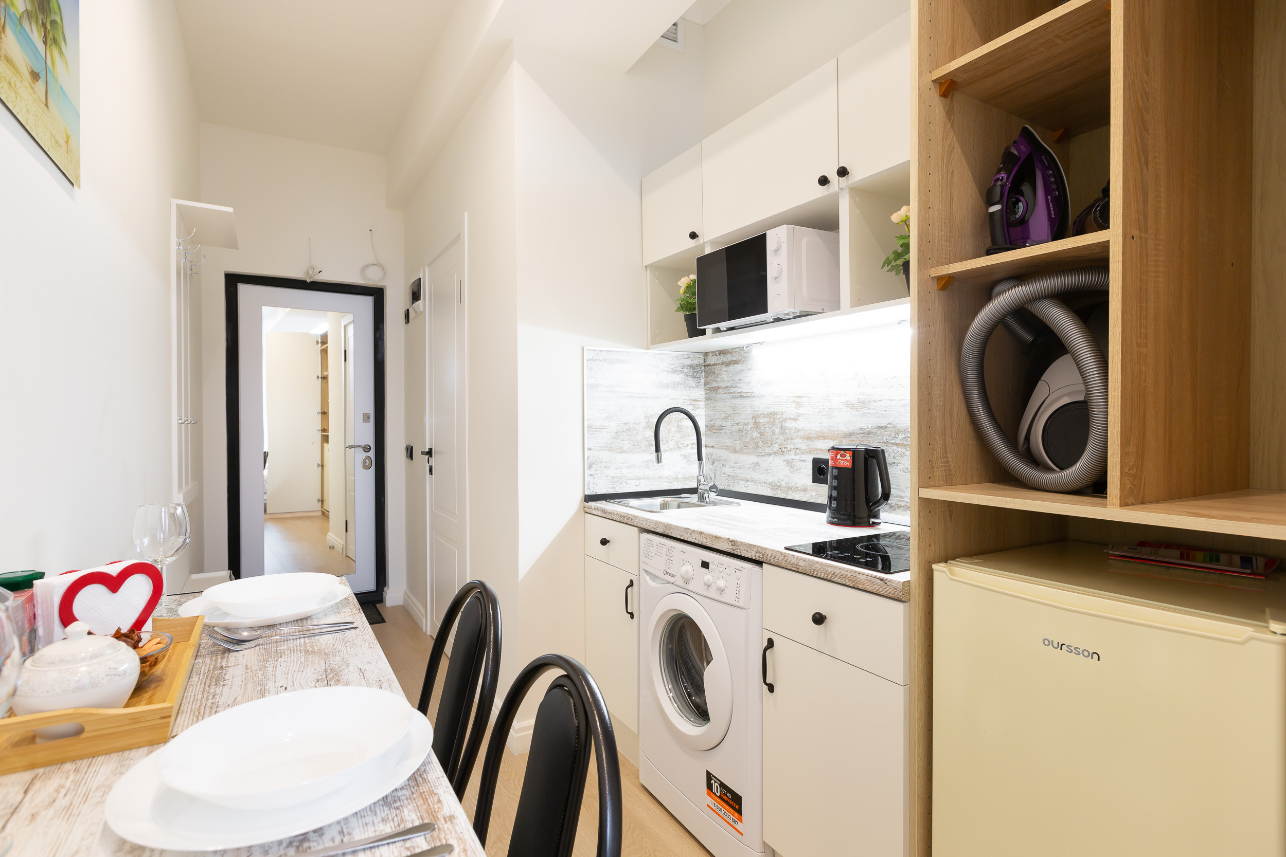 Под кухонную столешницу встроена стиральная машинка. Если нужно освежить вещи и привести их в нормальный вид после стирки, в вашем распоряжении сушилка и утюг.