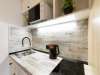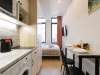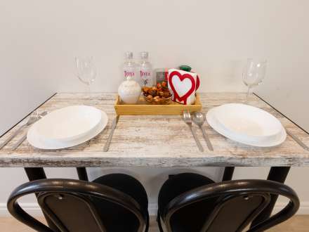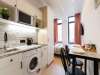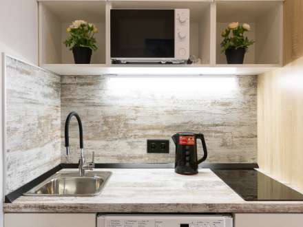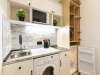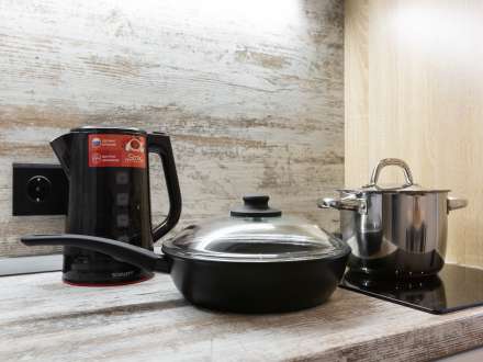 Кухня компактная, но со всей необходимой бытовой техникой: электрочайником, плитой, микроволновой печью и холодильником. Есть обеденный стол с двумя стульями. В шкафчиках вы найдете столовые приборы и посуду для готовки: кастрюли и сковороду.
