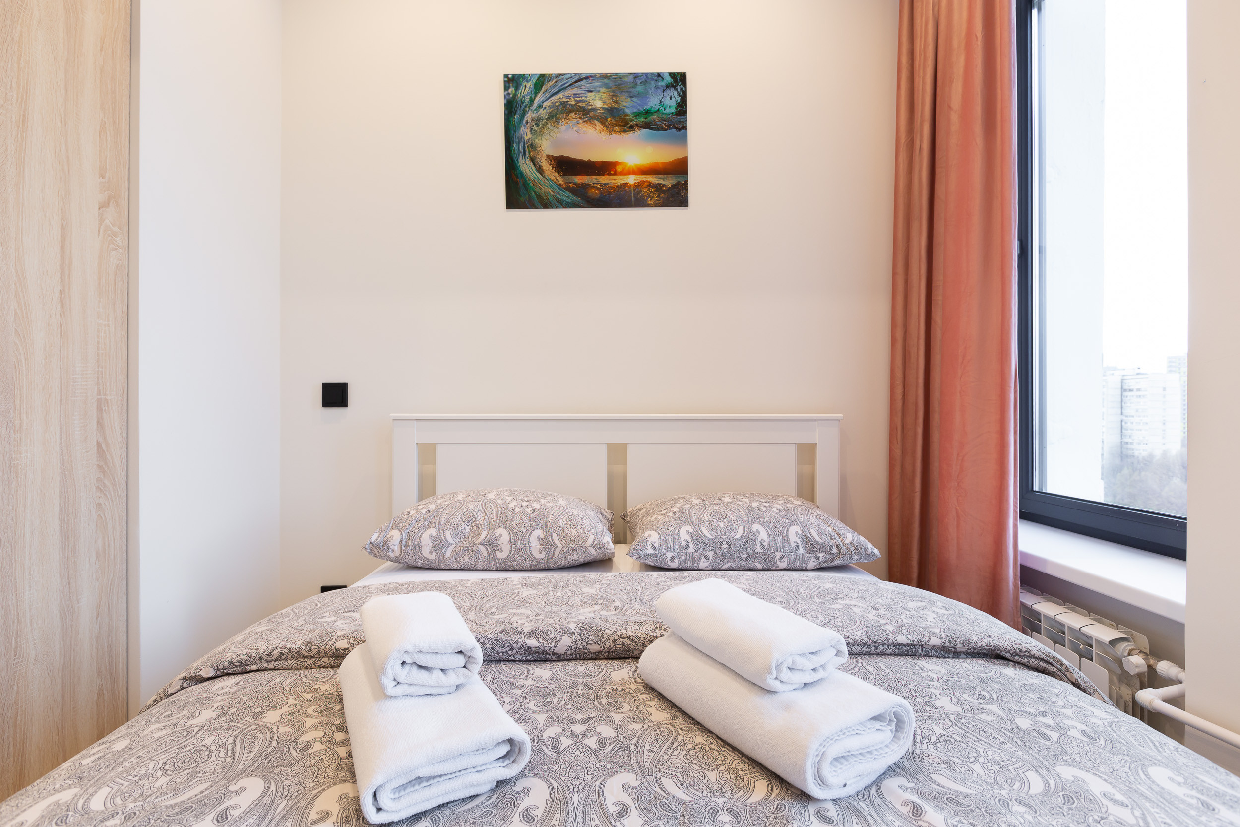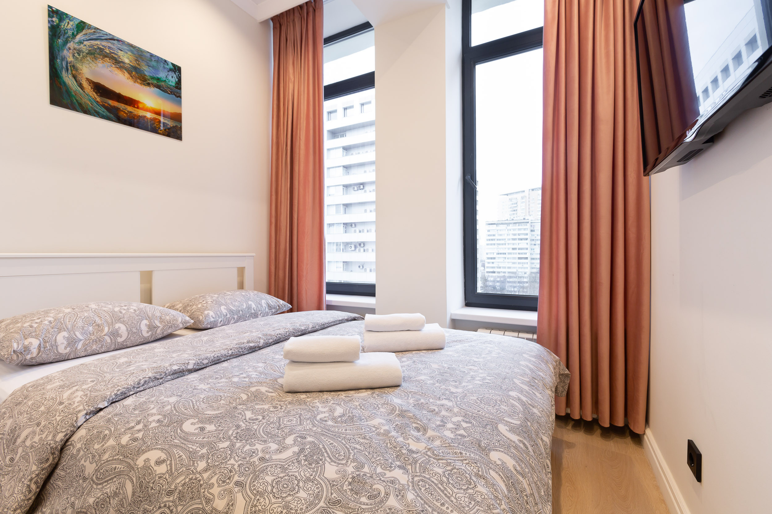 В комнате большая двуспальная кровать с постельными принадлежностями и свежим бельем, сразу из химчистки. Напротив на стене плазменный телевизор с USB-разъемом. Кроме TV можно смотреть фильмы с флешки. В квартире есть бесплатный высокоскоростной Wi-Fi.