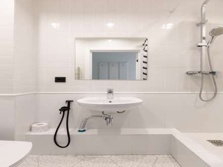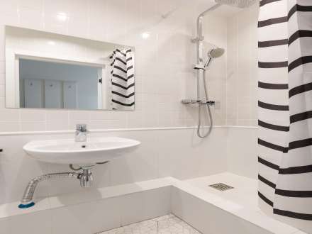 В ванной вы найдете свежие полотенца, гель для душа, мыло, шампунь и туалетную бумагу. Вся сантехника (унитаз и рукомойник) в идеальном состоянии. Вместо ванны установлен душ со шторкой. Над рукомойником есть зеркало, а слева стационарный фен.