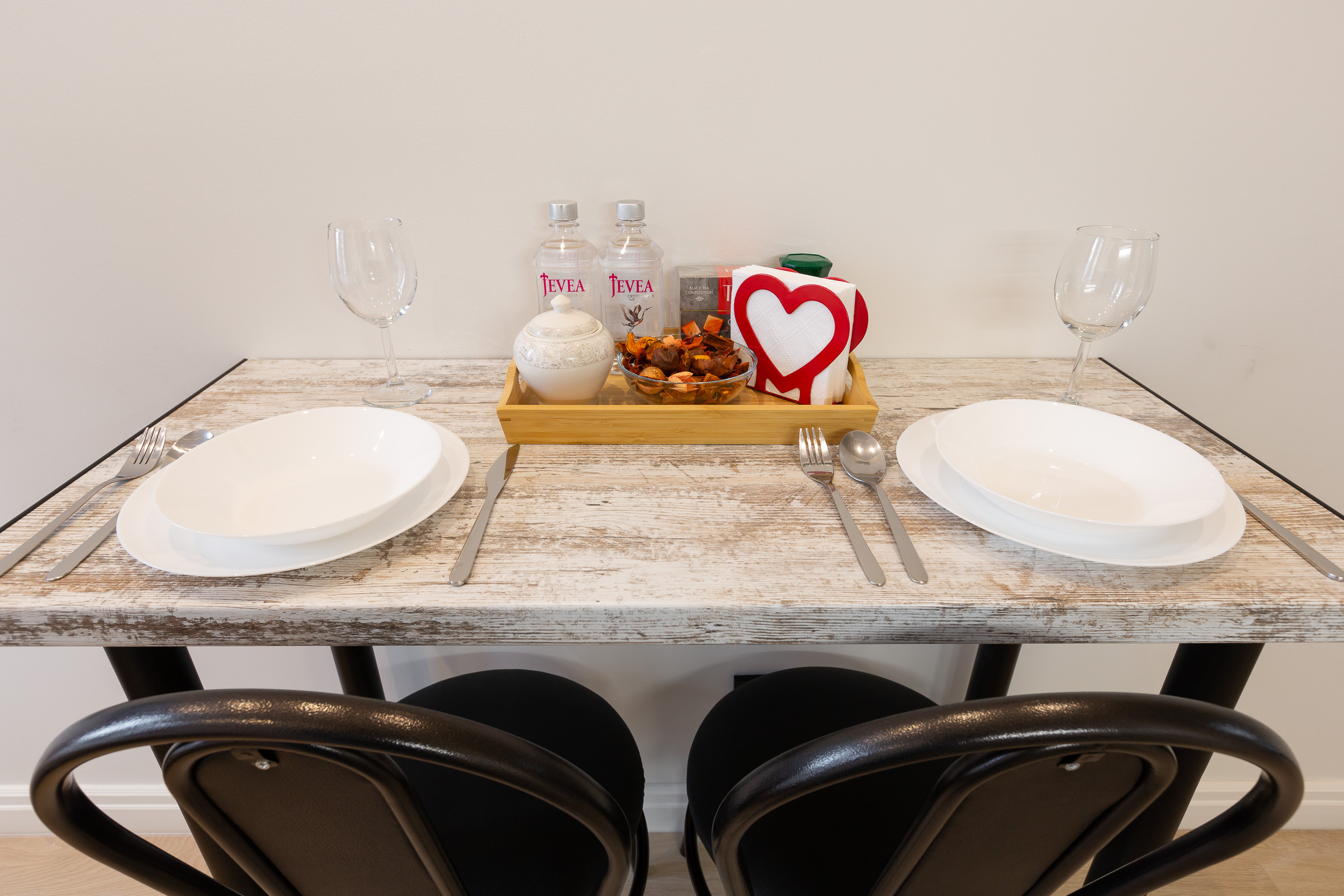 Для всех гостей у нас бесплатная бутилированная вода, чай, кофе, сахар, соль и салфетки.