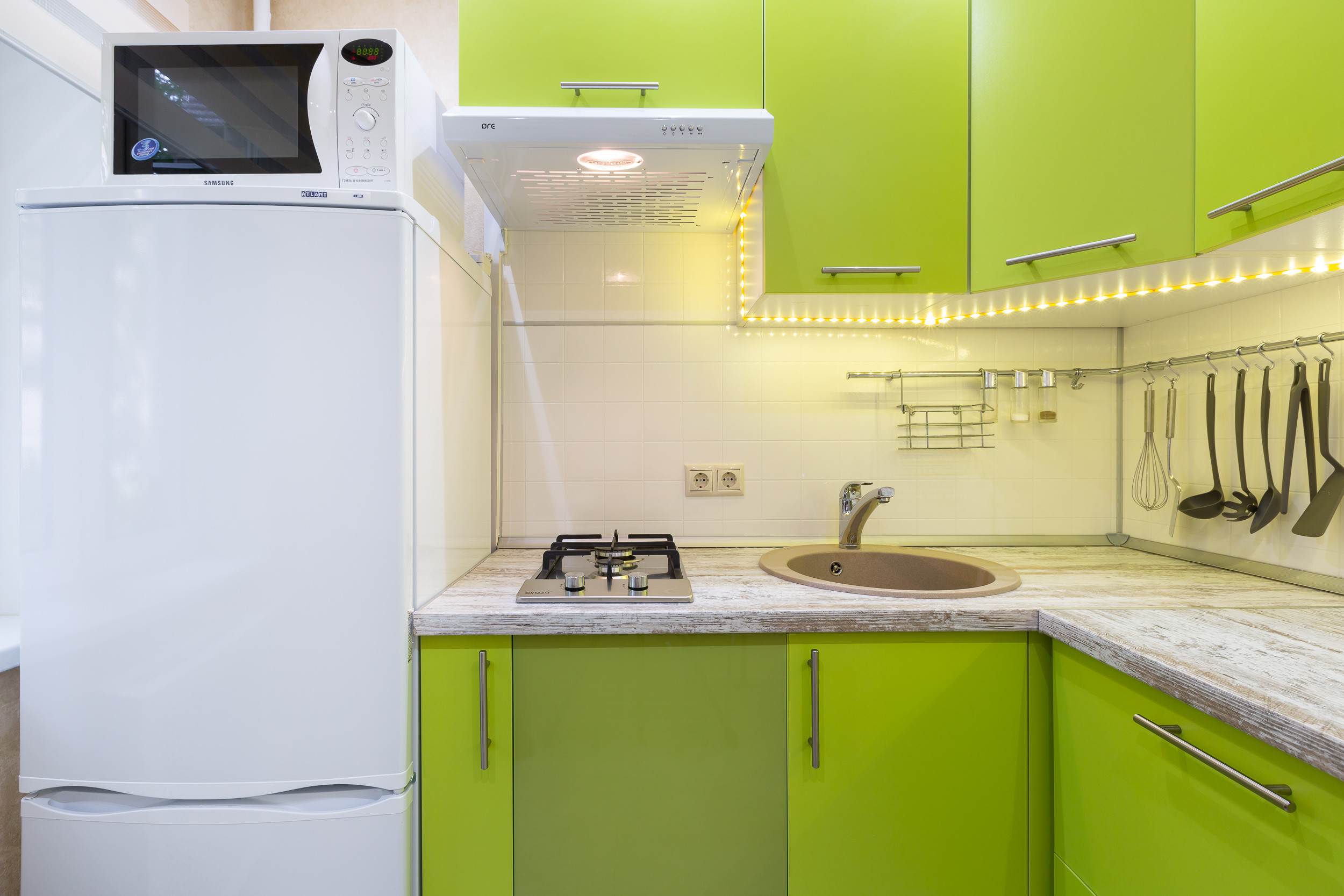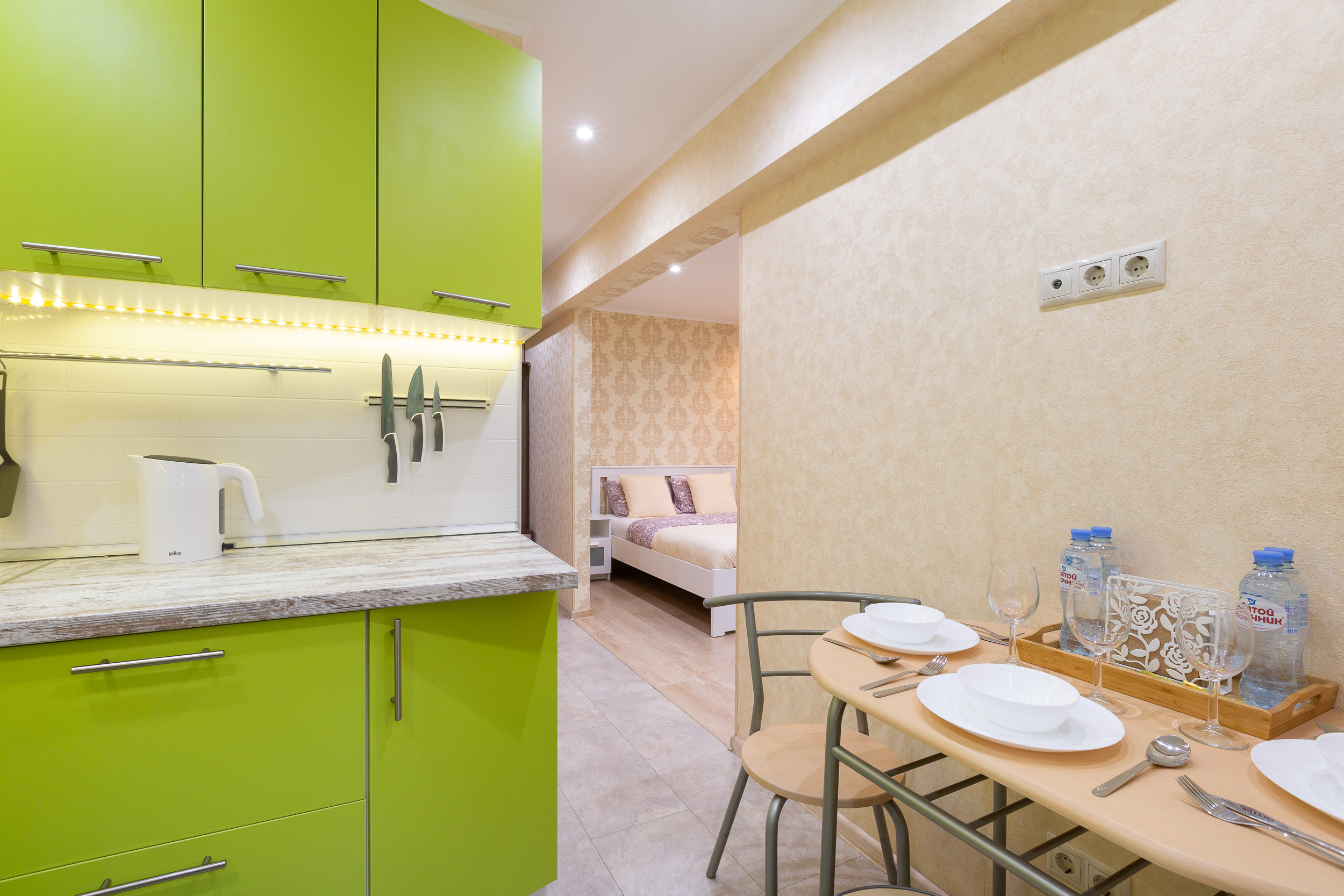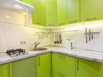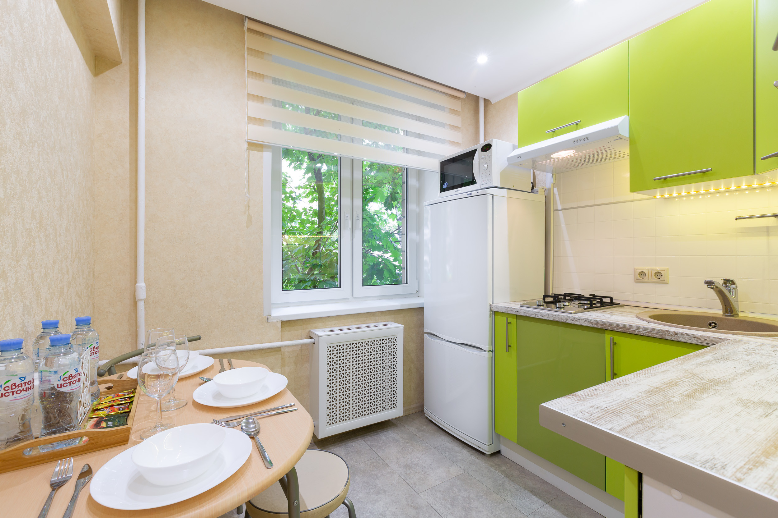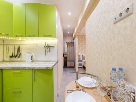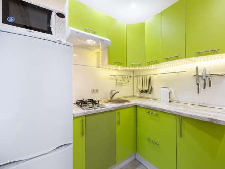 • Обустроенную меблированную кухню. Вы можете пользоваться холодильником, электрочайником, микроволновой плитой.