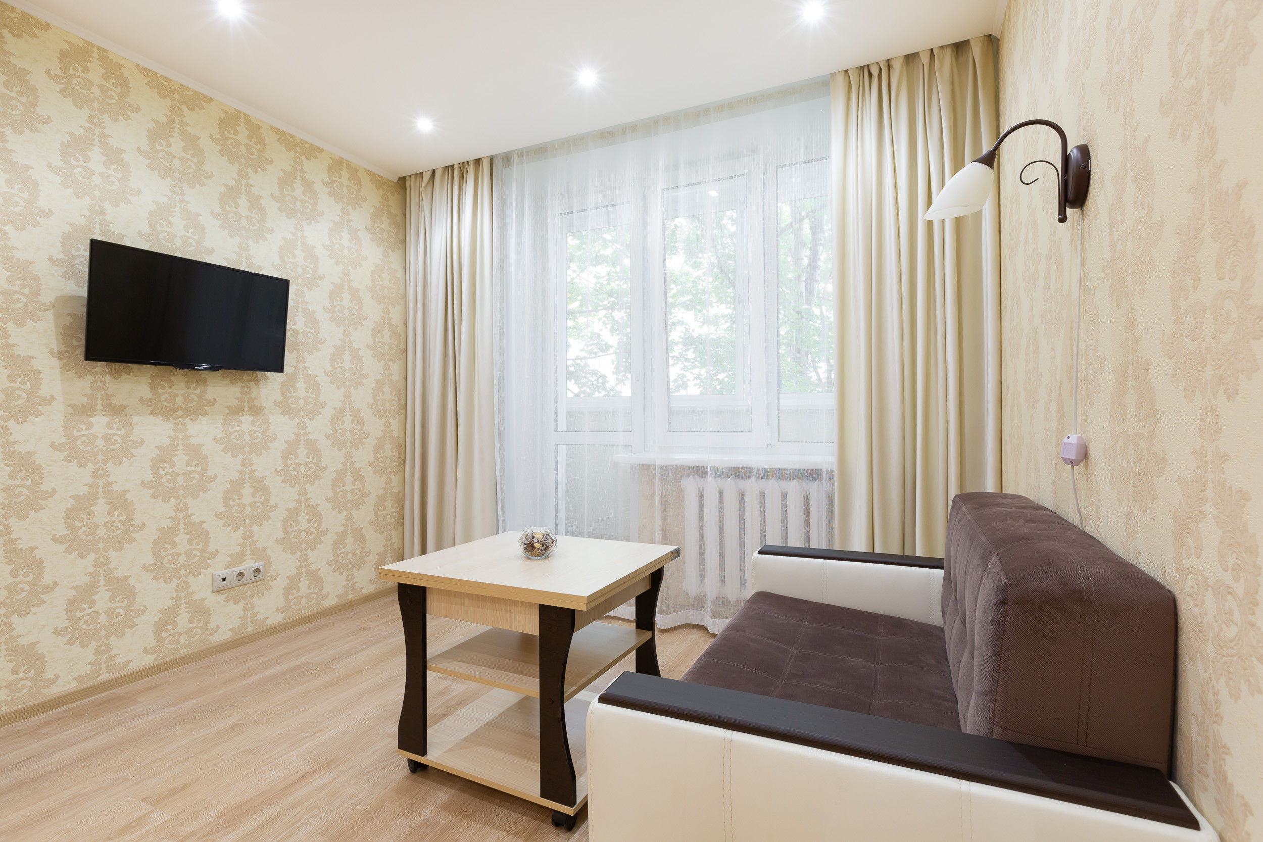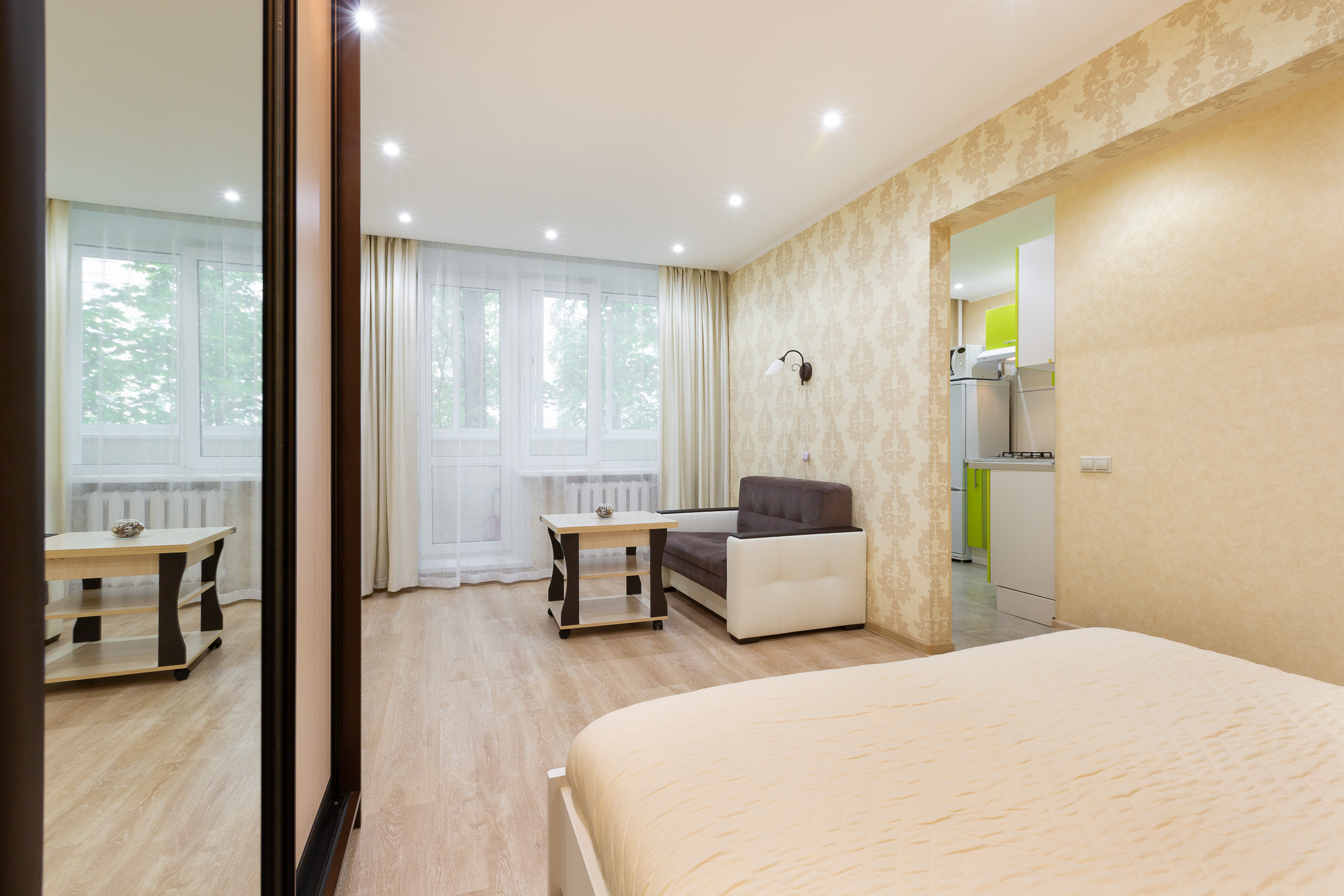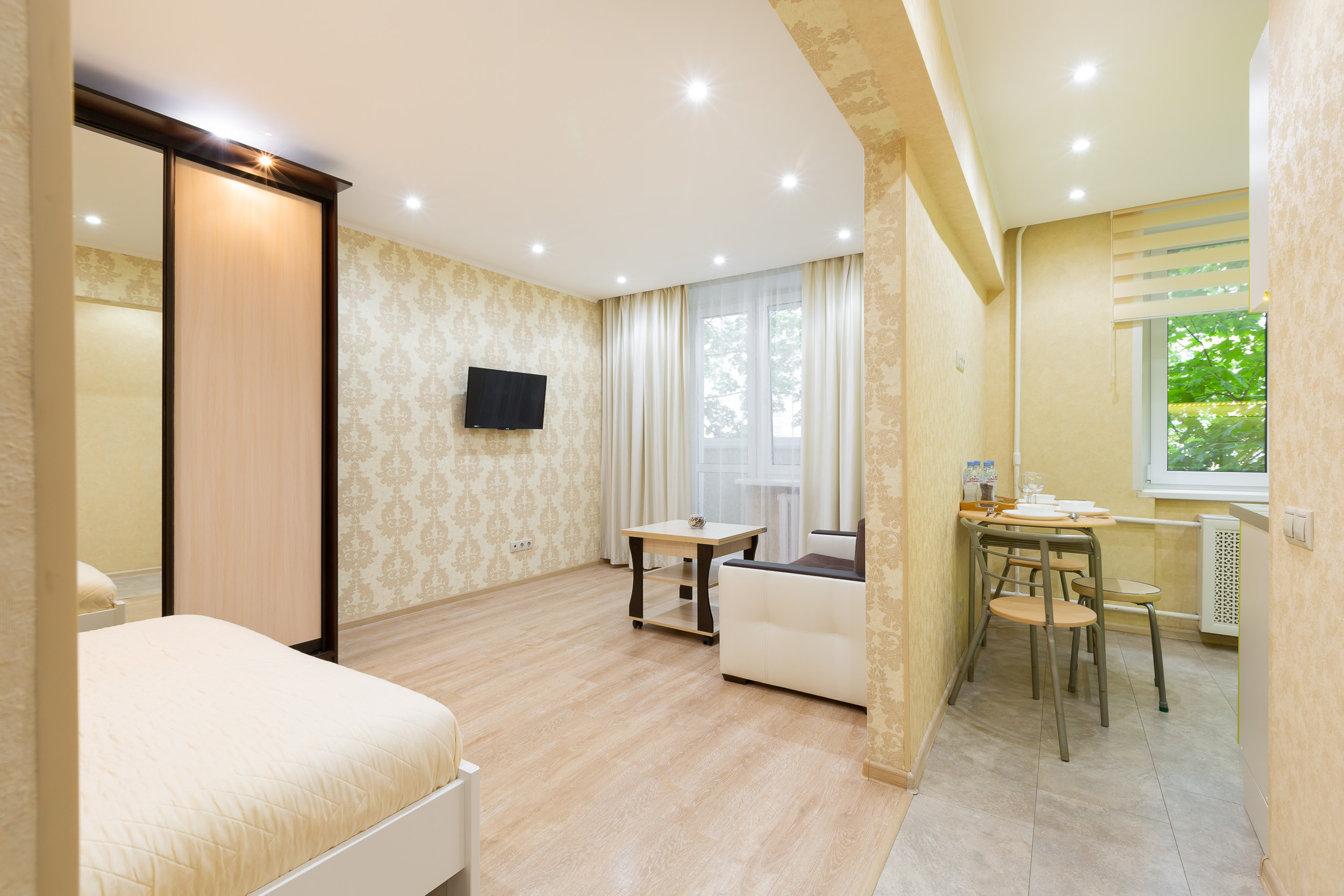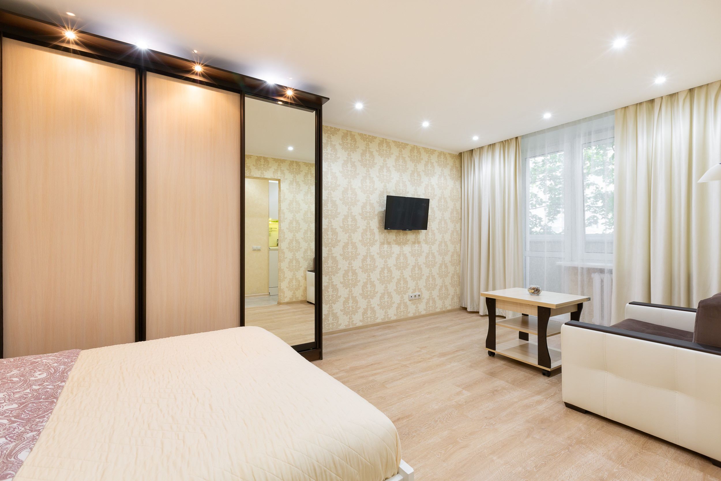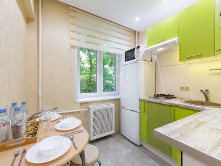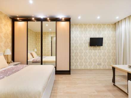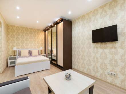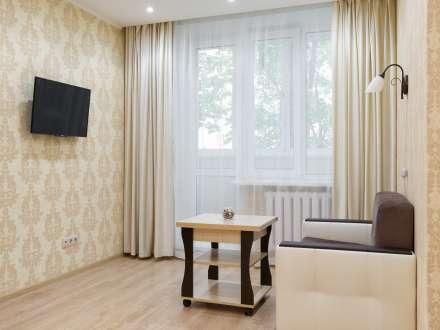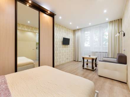 Квартира находится на 3 этаже пятиэтажного дома. Она рассчитана на прием до 4 гостей. Она состоит из одной комнаты с двуспальной кроватью и диваном. Есть встроенный шкаф для хранения вещей. Гостям предлагают: