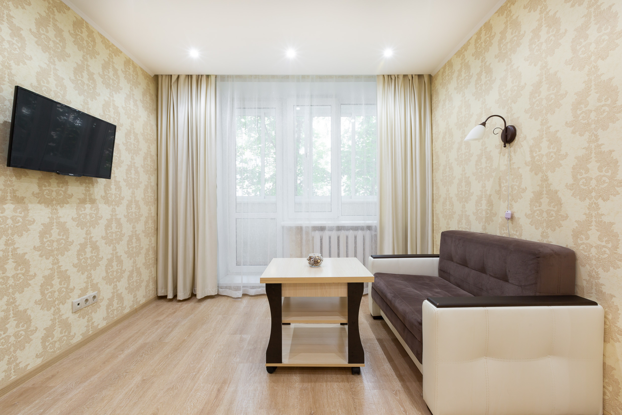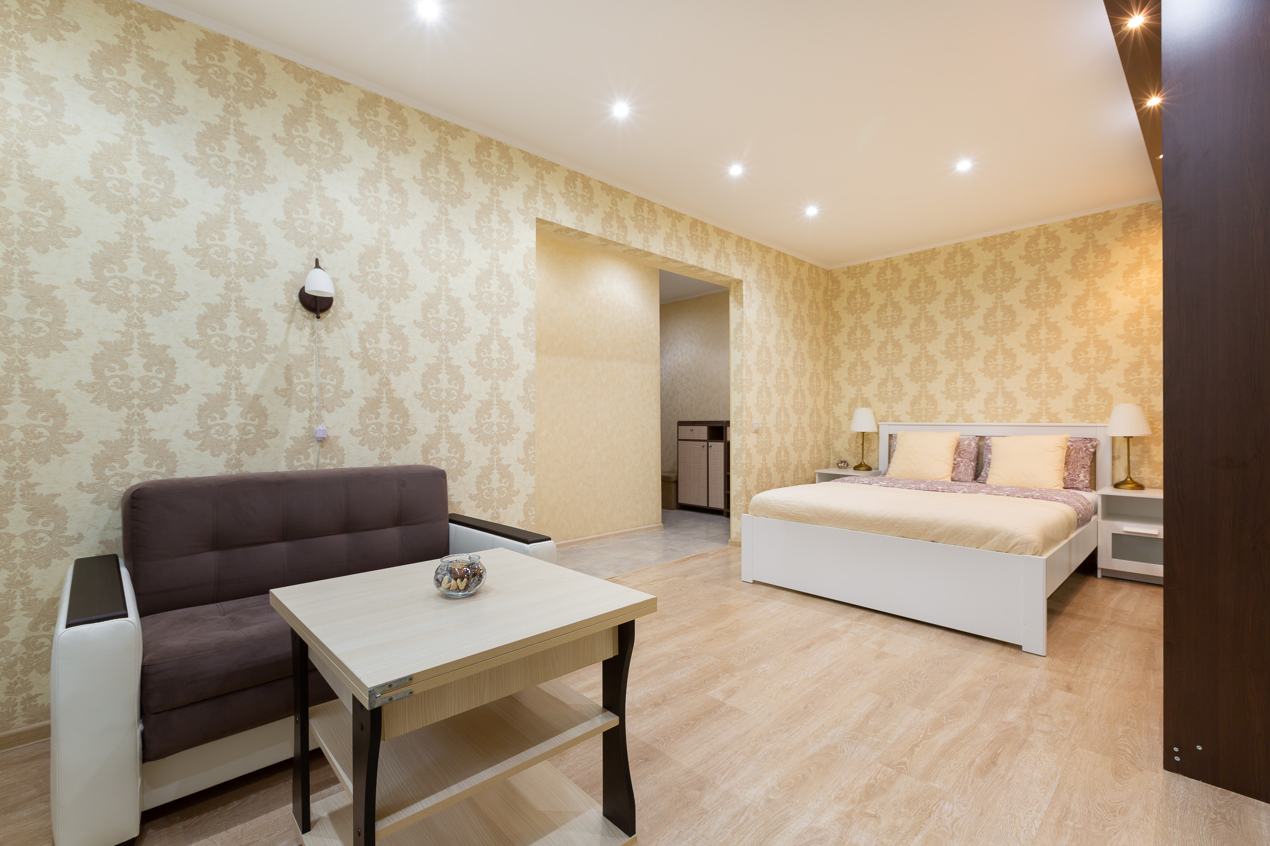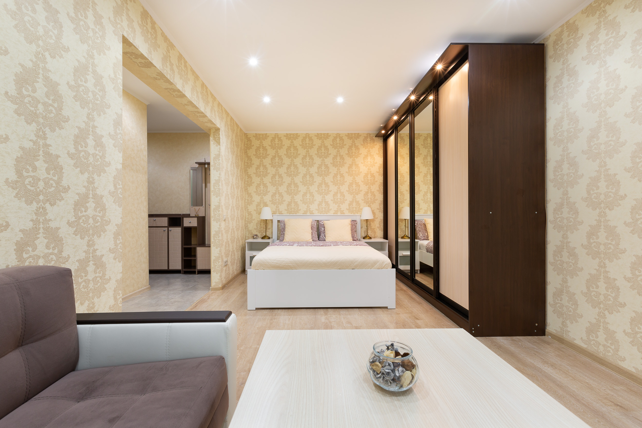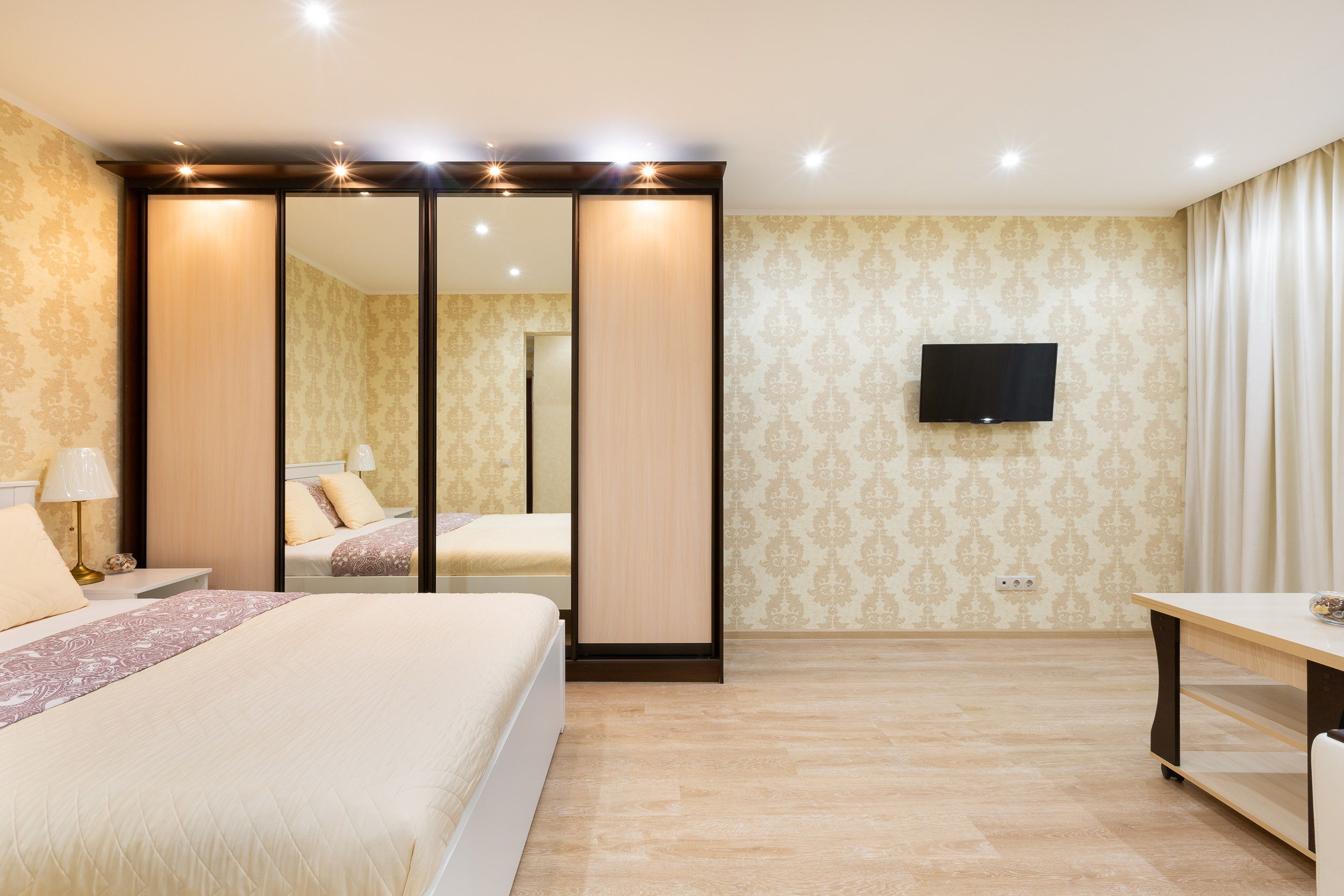 Квартира находится на 3 этаже пятиэтажного дома. Она рассчитана на прием до 4 гостей. Она состоит из одной комнаты с двуспальной кроватью и диваном. Есть встроенный шкаф для хранения вещей. Гостям предлагают: