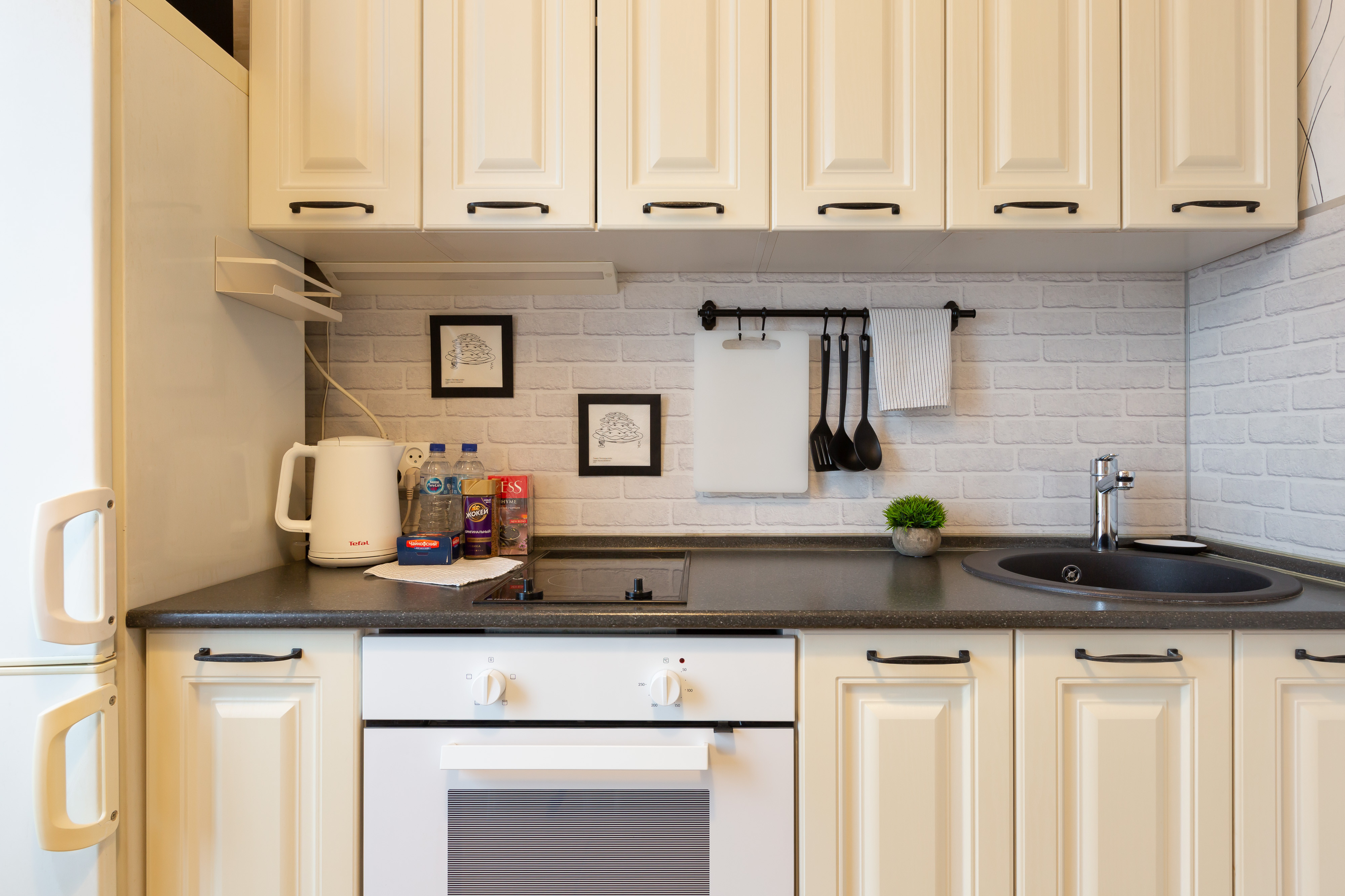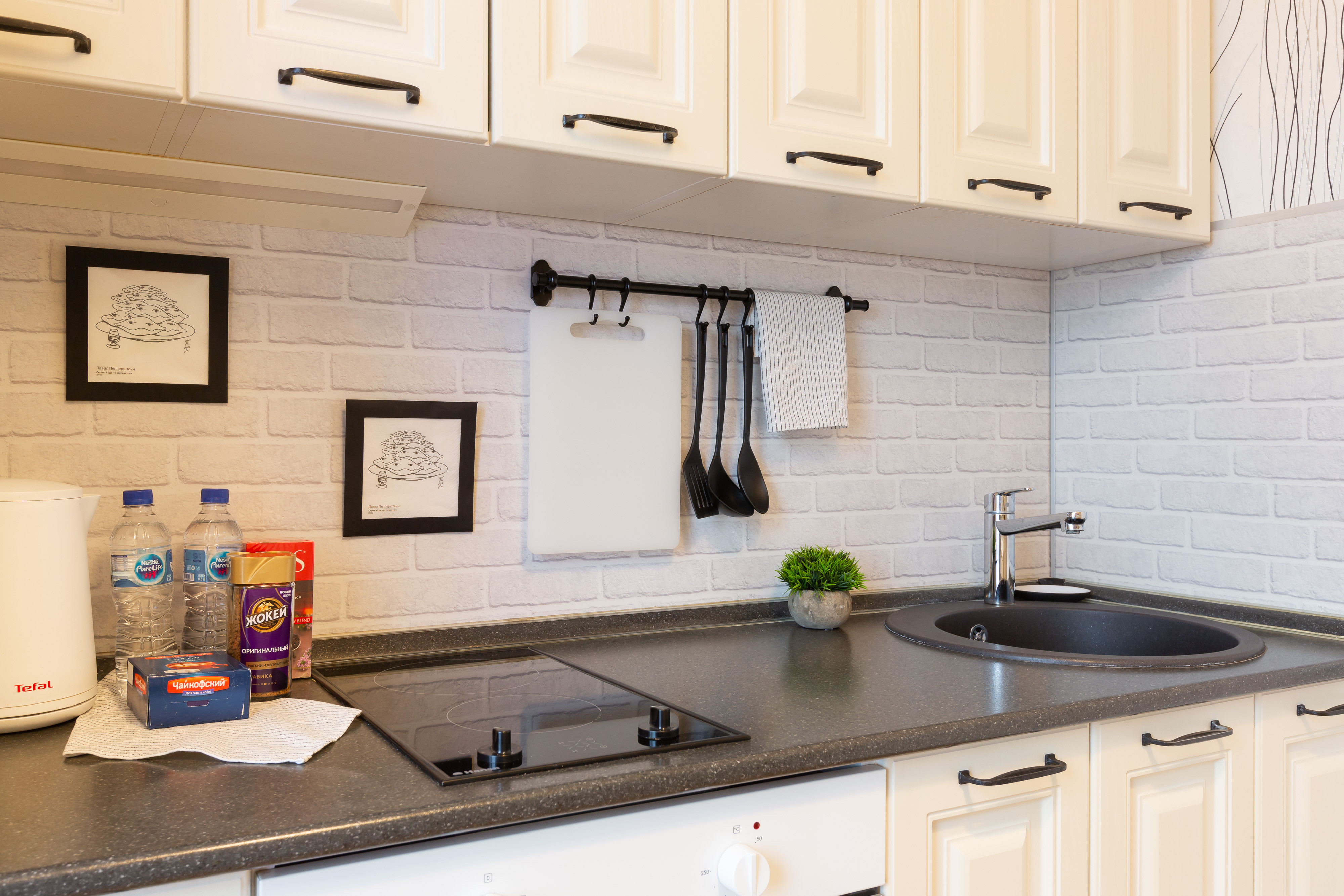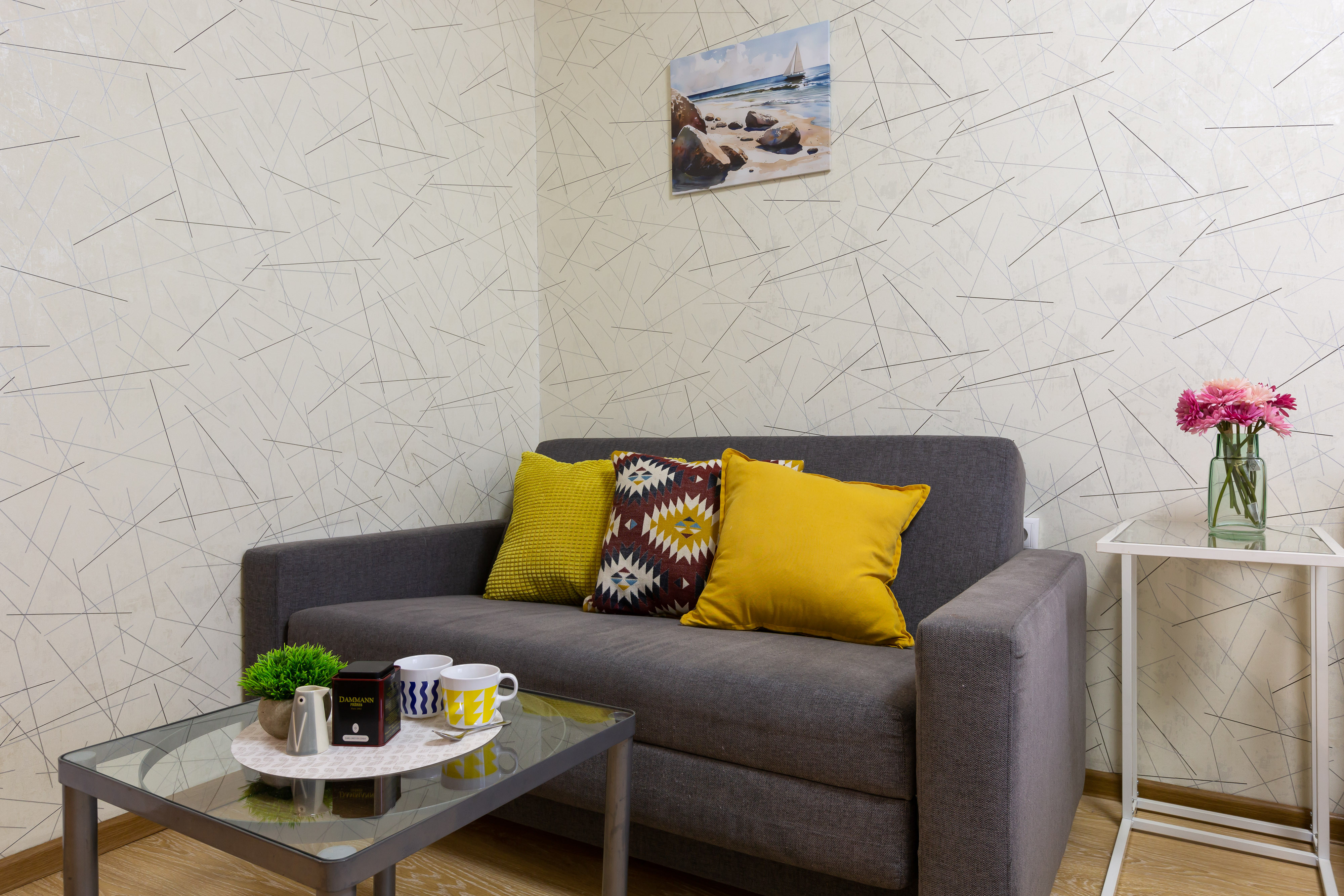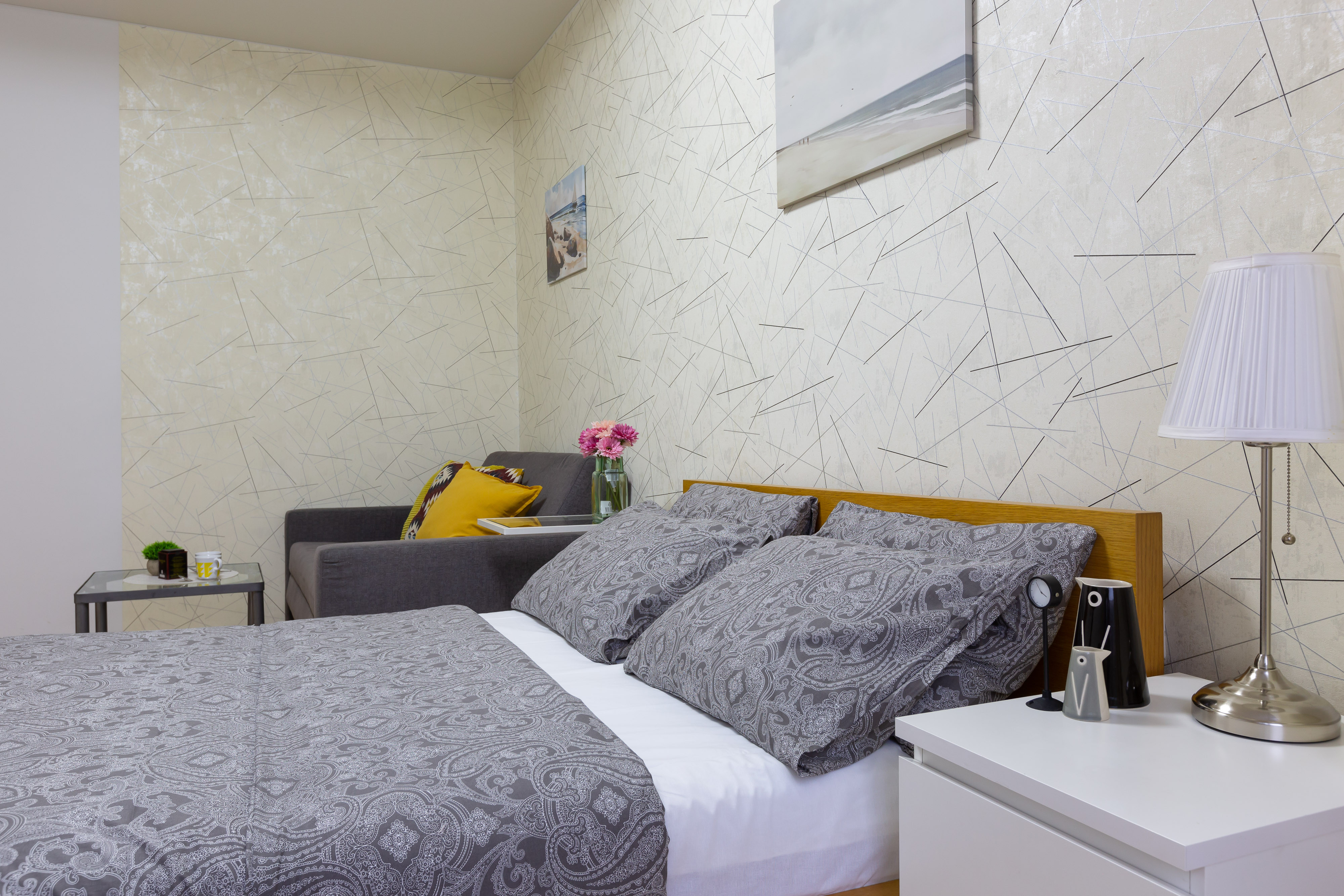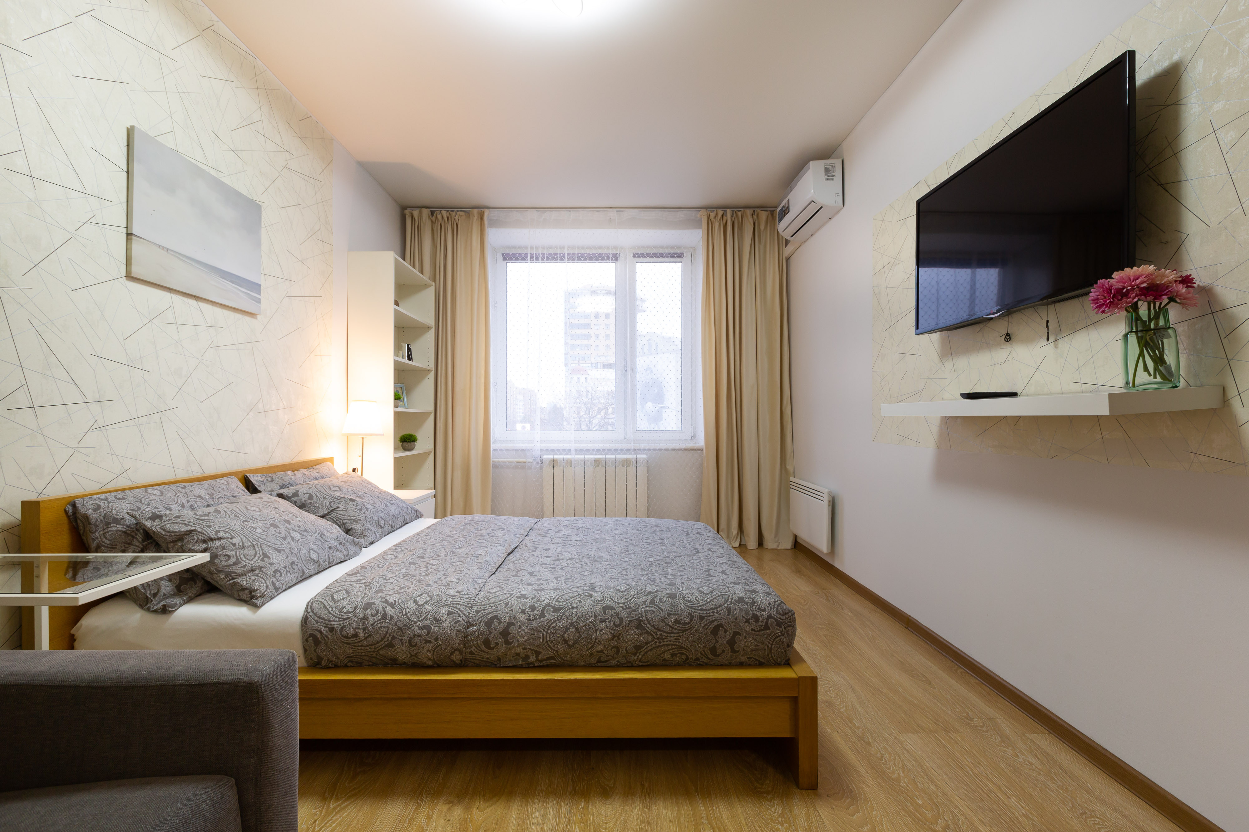 Modern furniture, a double bed and a double sofa bed, appliances, high-speed Wi-Fi, satellite TV, a washing machine, ironing board, and clothes dryer. A fully equipped kitchen, full set of dishes for cooking and eating, and air conditioning.