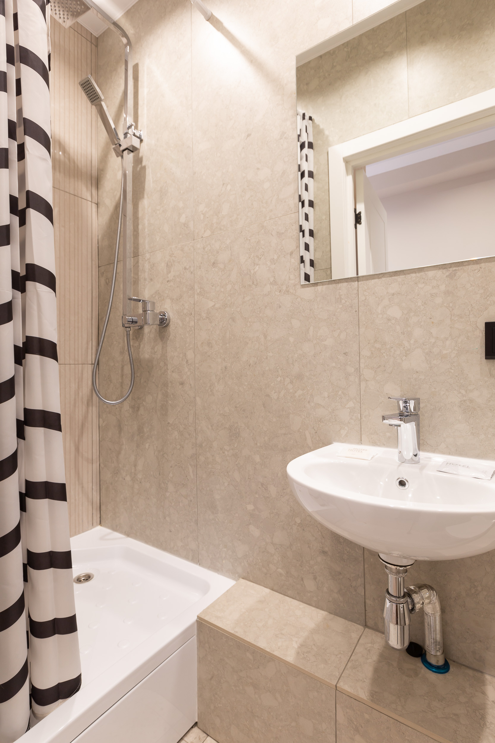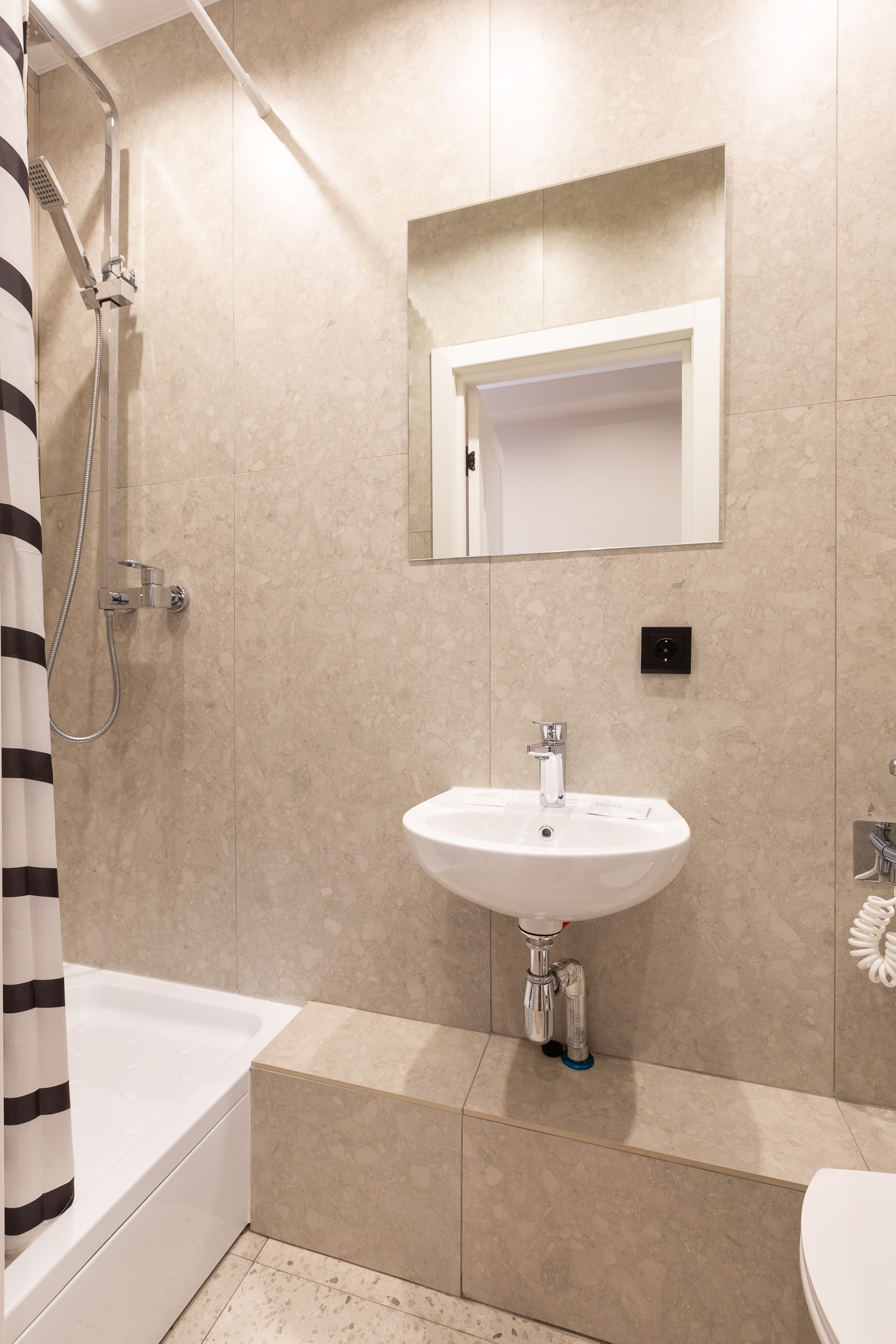 In the combined bathroom there is a bath with a shower, a toilet bowl, a washstand and a mirror. Guests are provided with fresh towels, a hairdryer and personal hygiene products: shower gel, shampoo and soap.