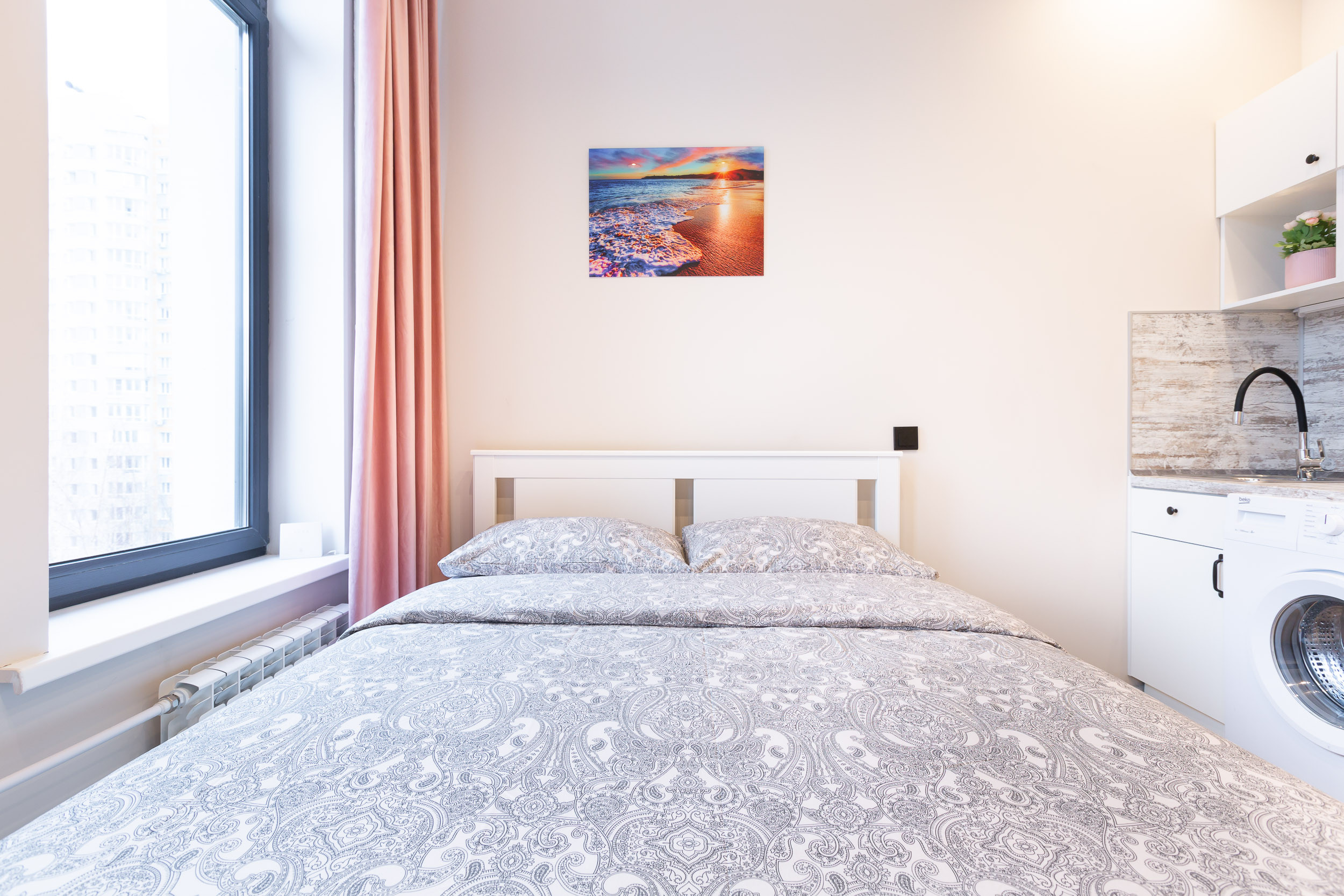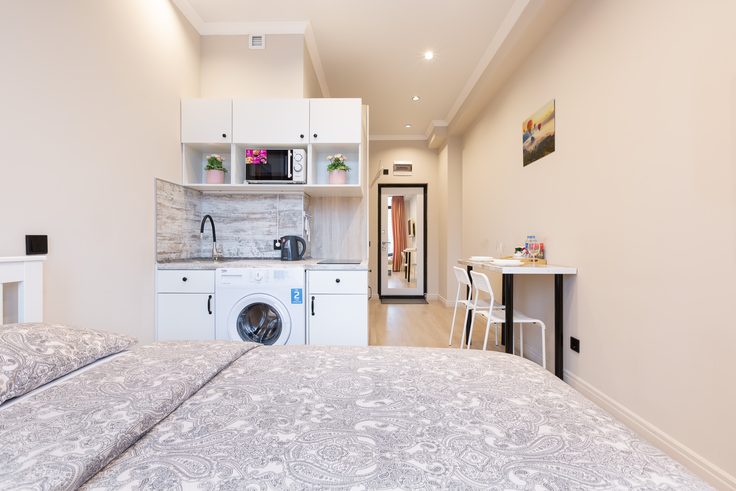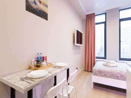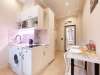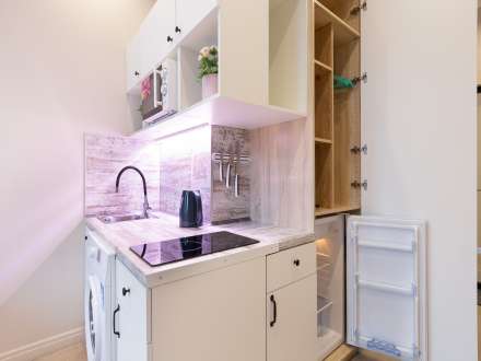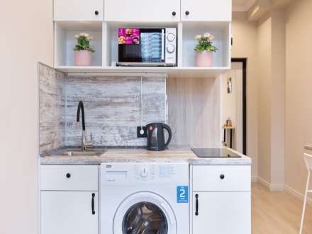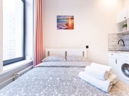 Studio apartment is bright and spacious, renovated and furnished with new furniture. The space of the room is organized as conveniently as possible.