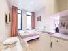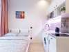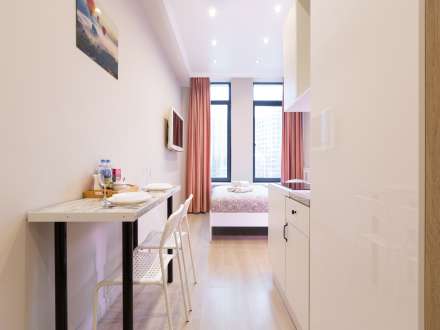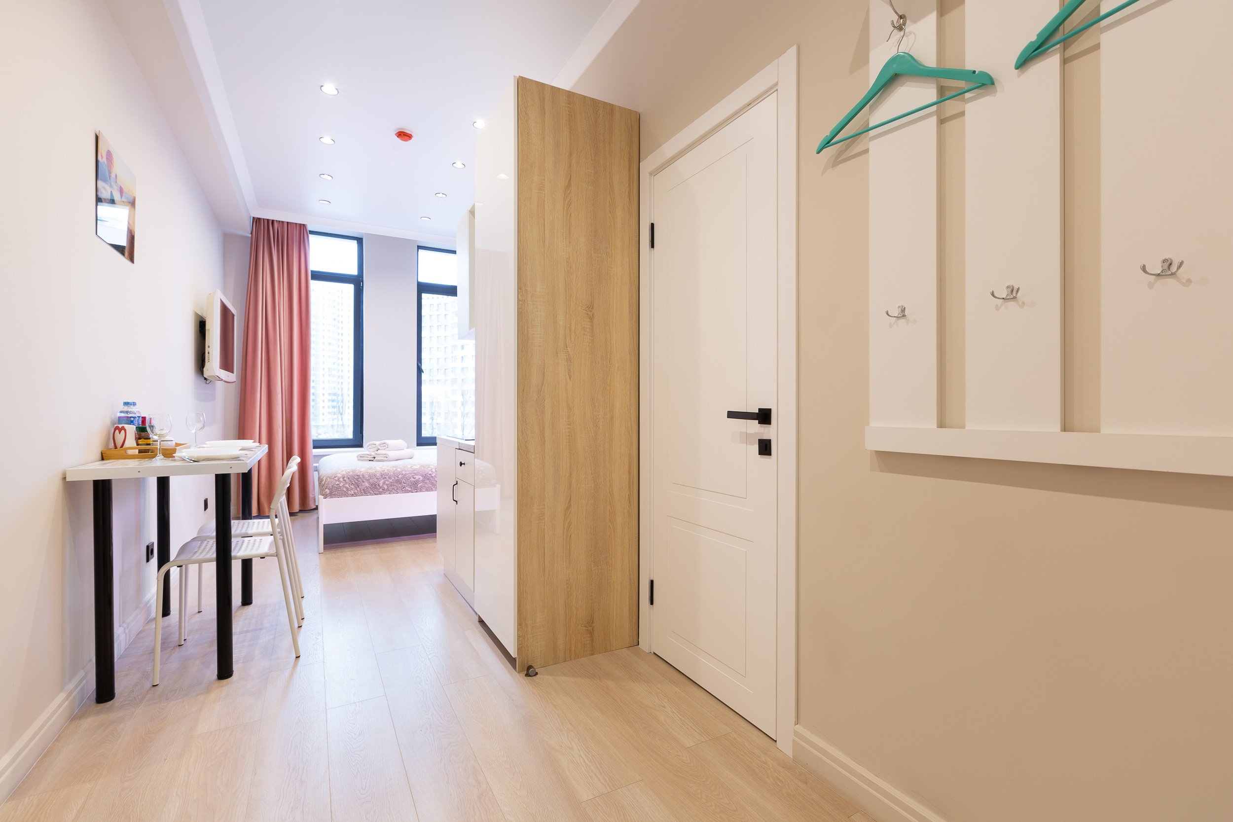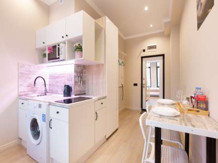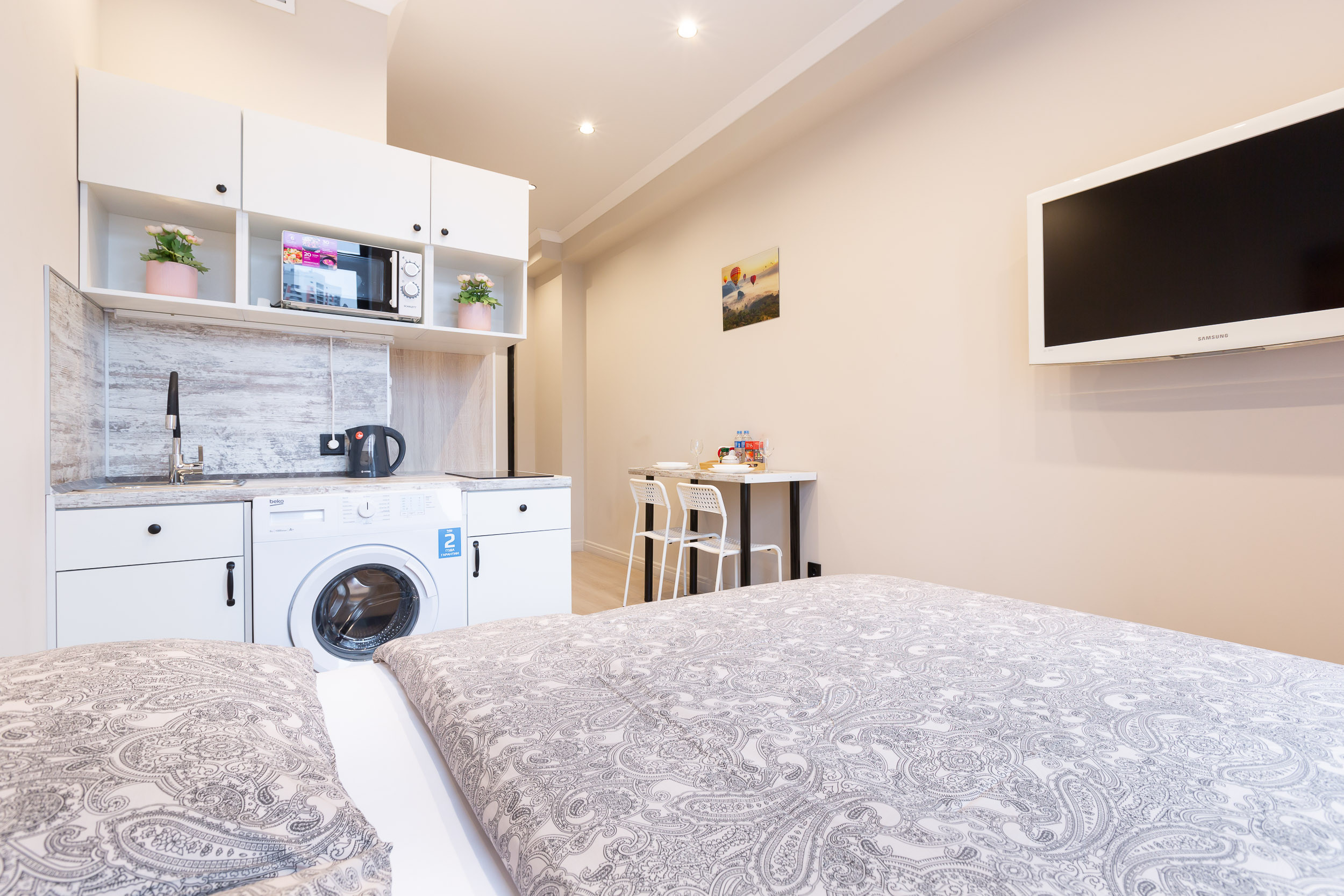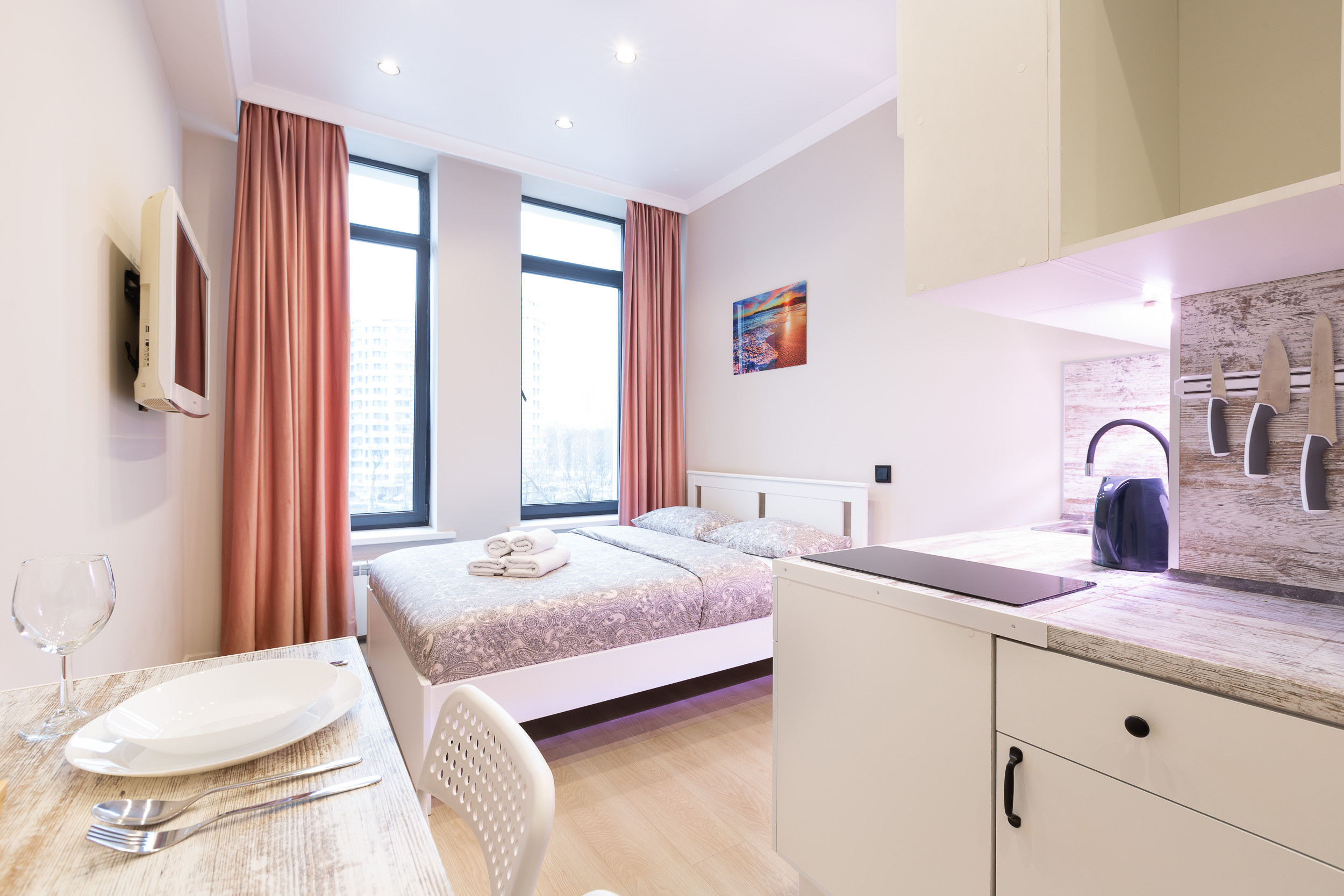 Studio apartment is bright and spacious, renovated and furnished with new furniture. The space of the room is organized as conveniently as possible.