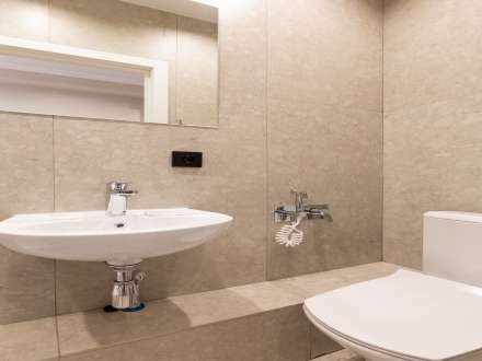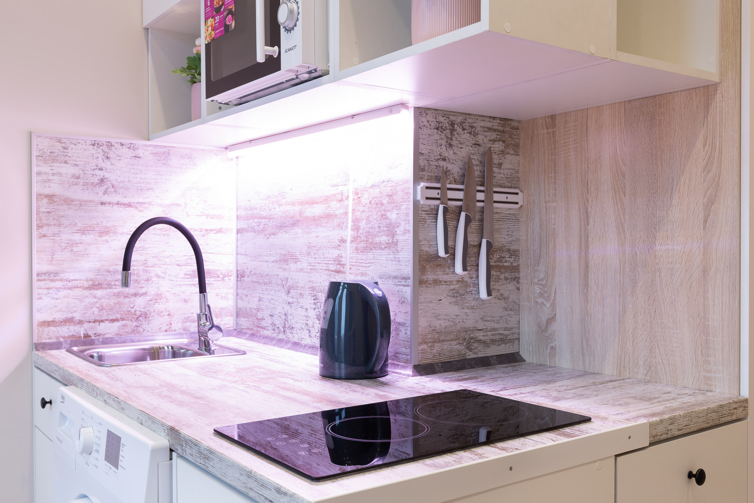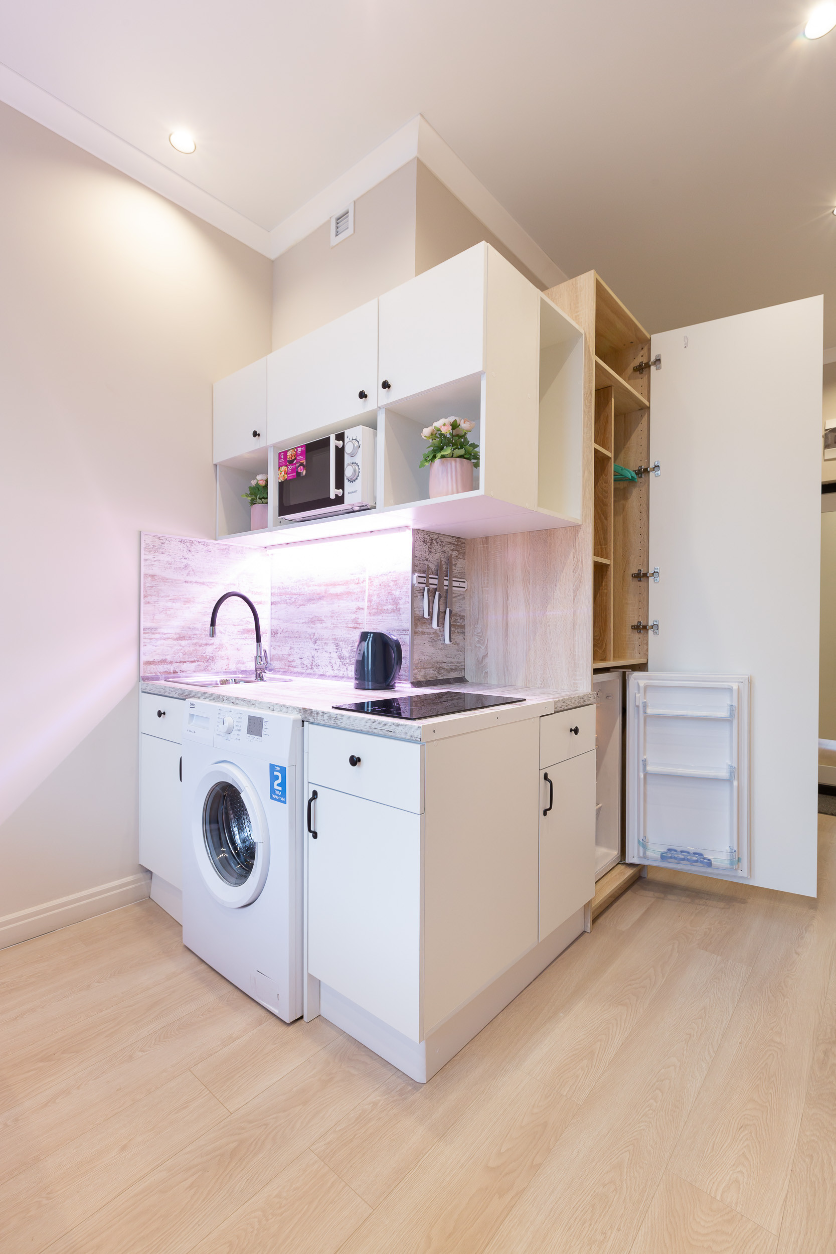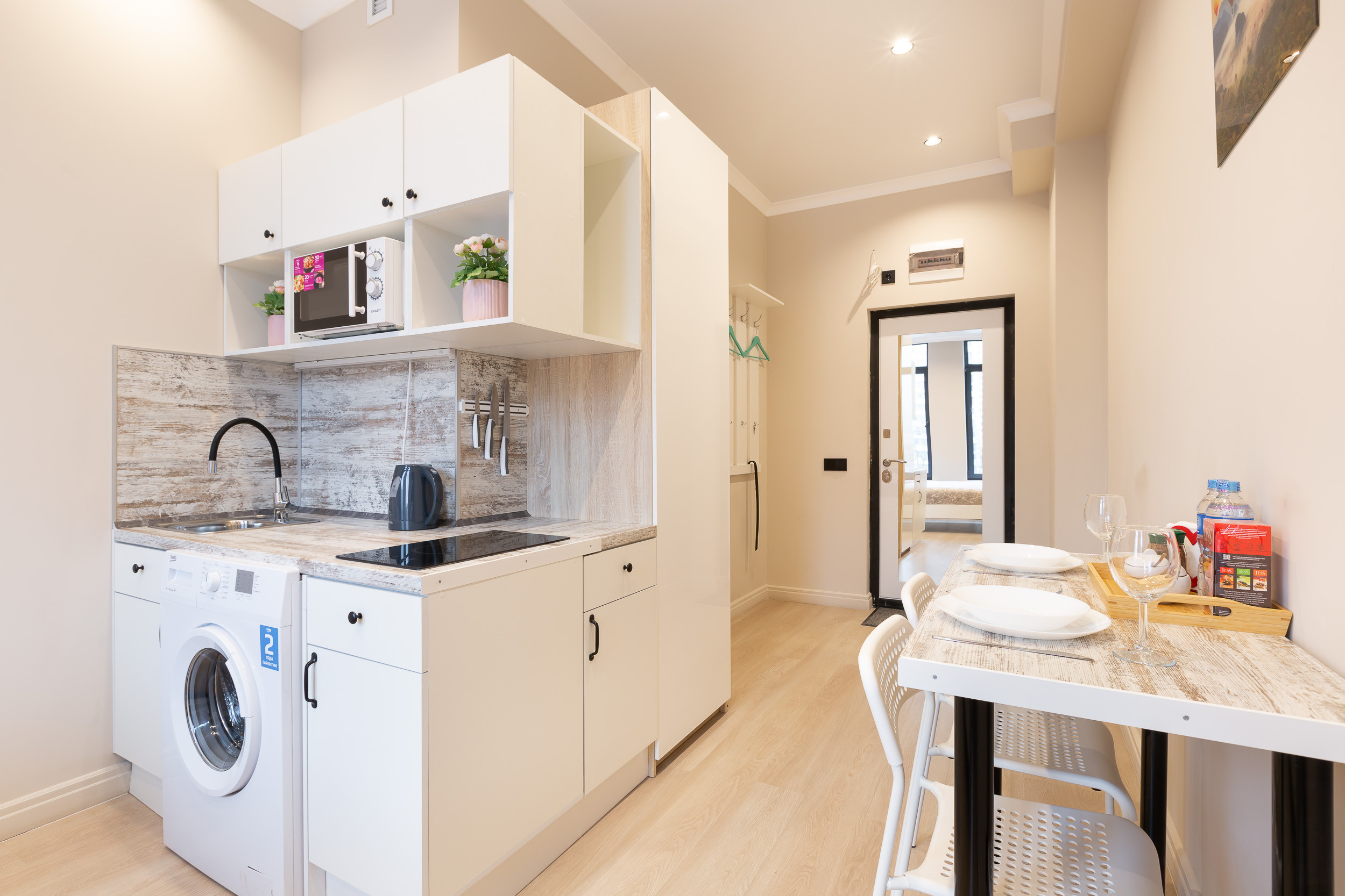 In the kitchen area there is an electric stove, an electric kettle, a microwave oven and a built-in refrigerator. In the bedside tables and hanging cabinets you will find all the necessary utensils, knives and cutlery.
