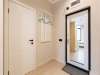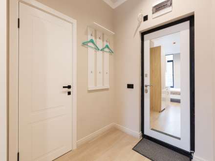 There is a human-length mirror on the front door, in the hallway there is a clothes hanger with hangers.