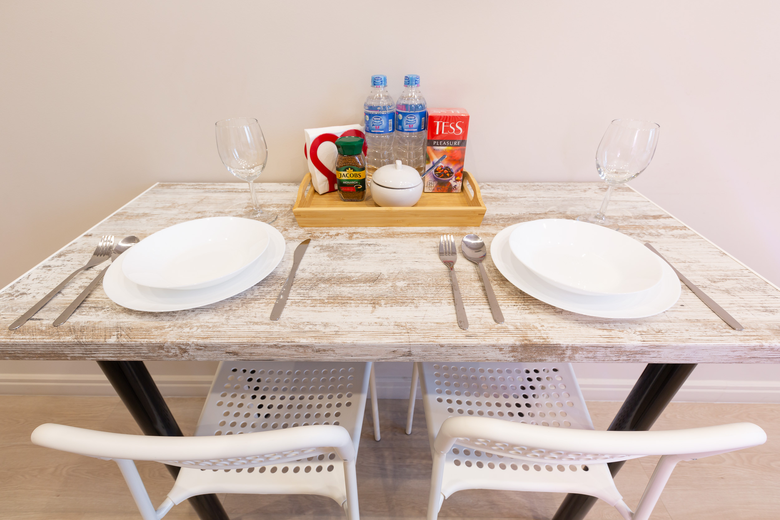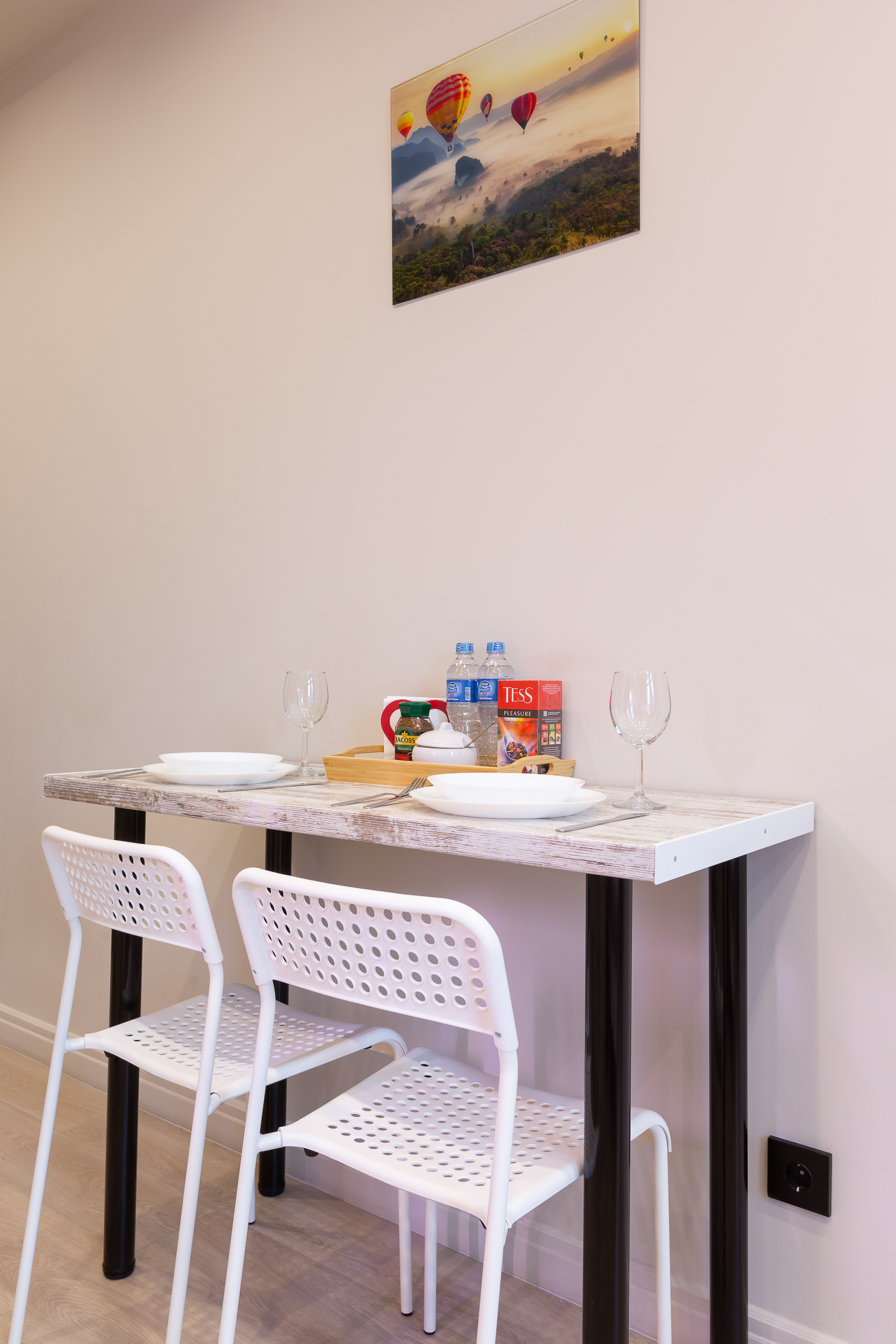 For guests, we offer free tea, coffee, bottled drinking water, as well as sugar and salt. For eating there is a small wall table and two comfortable chairs.