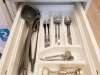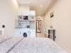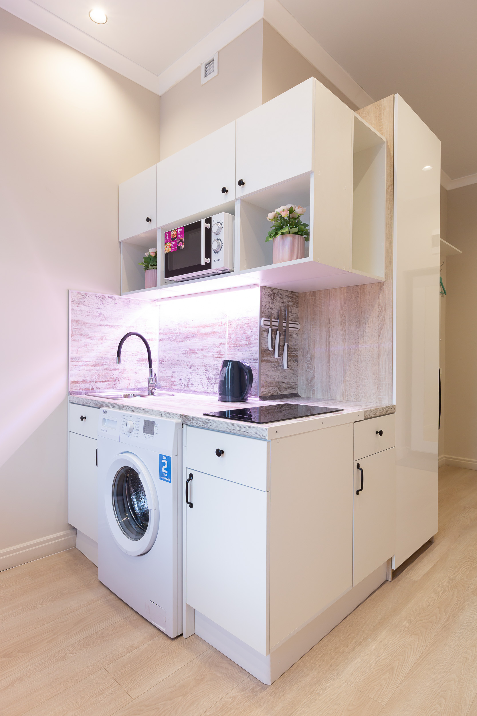A washing machine is built into the countertop near the sink. To dry clothes, you can use the dryer, and to give a neat look — iron.